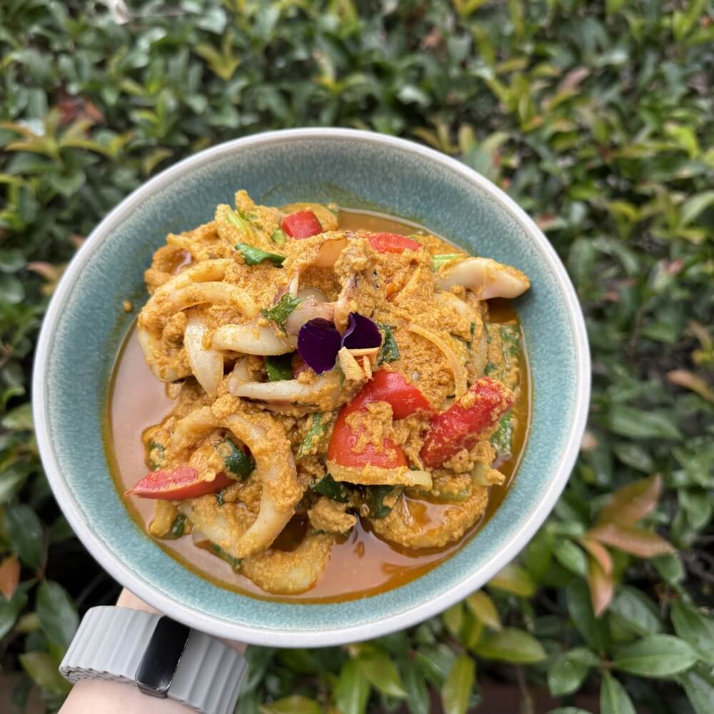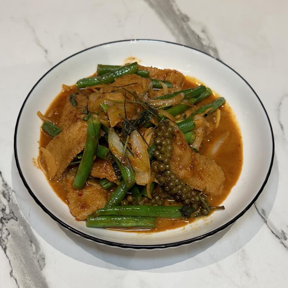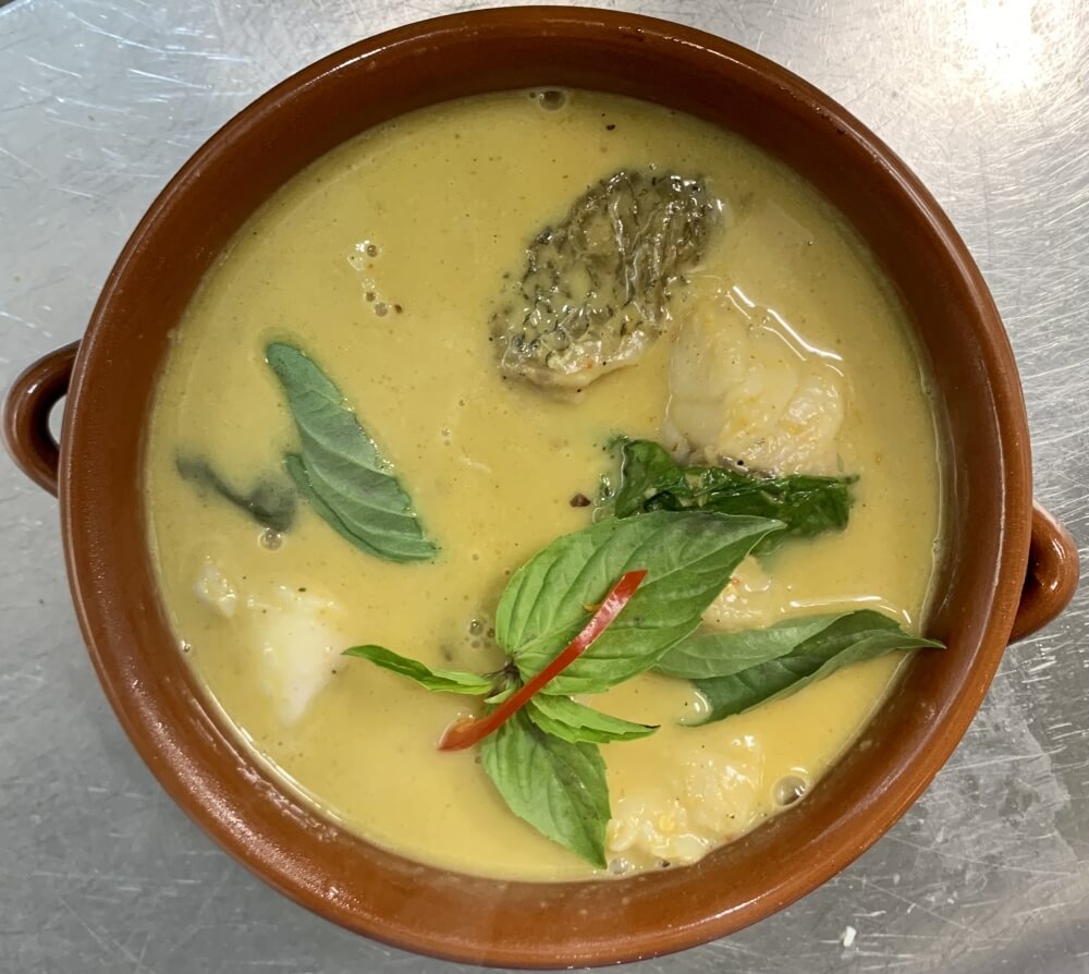 Barramundi fillet cooked in coconut milk, betel leaves, turmeric, shrimp paste and chilli