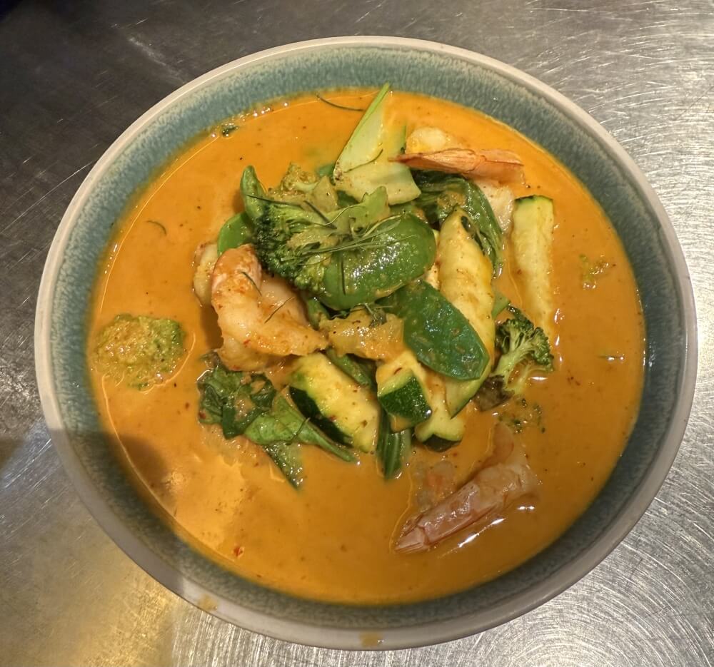 Prawns, aromatic choo-chee curry paste, coconut cream, green vegetables and kaffir lime leaves