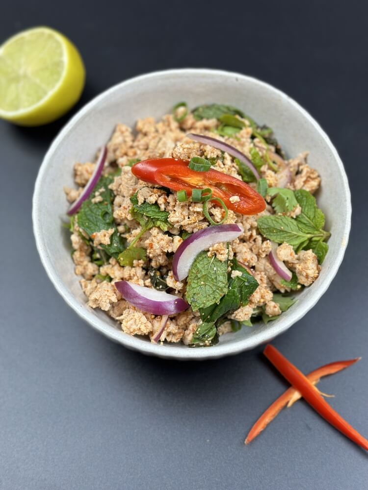 Minced chicken, red onion, mint, shallot, chilli flakes and powdered roasted rice