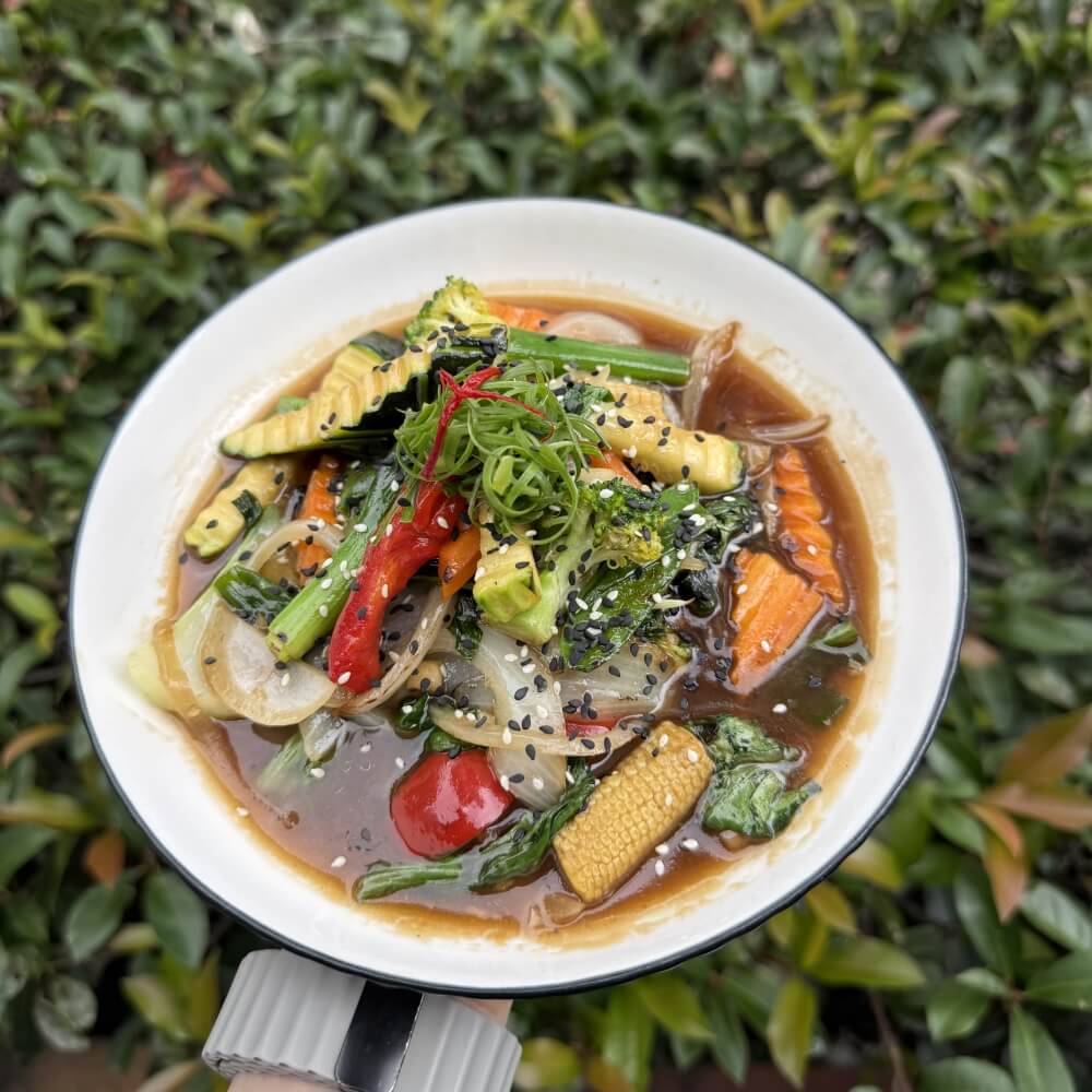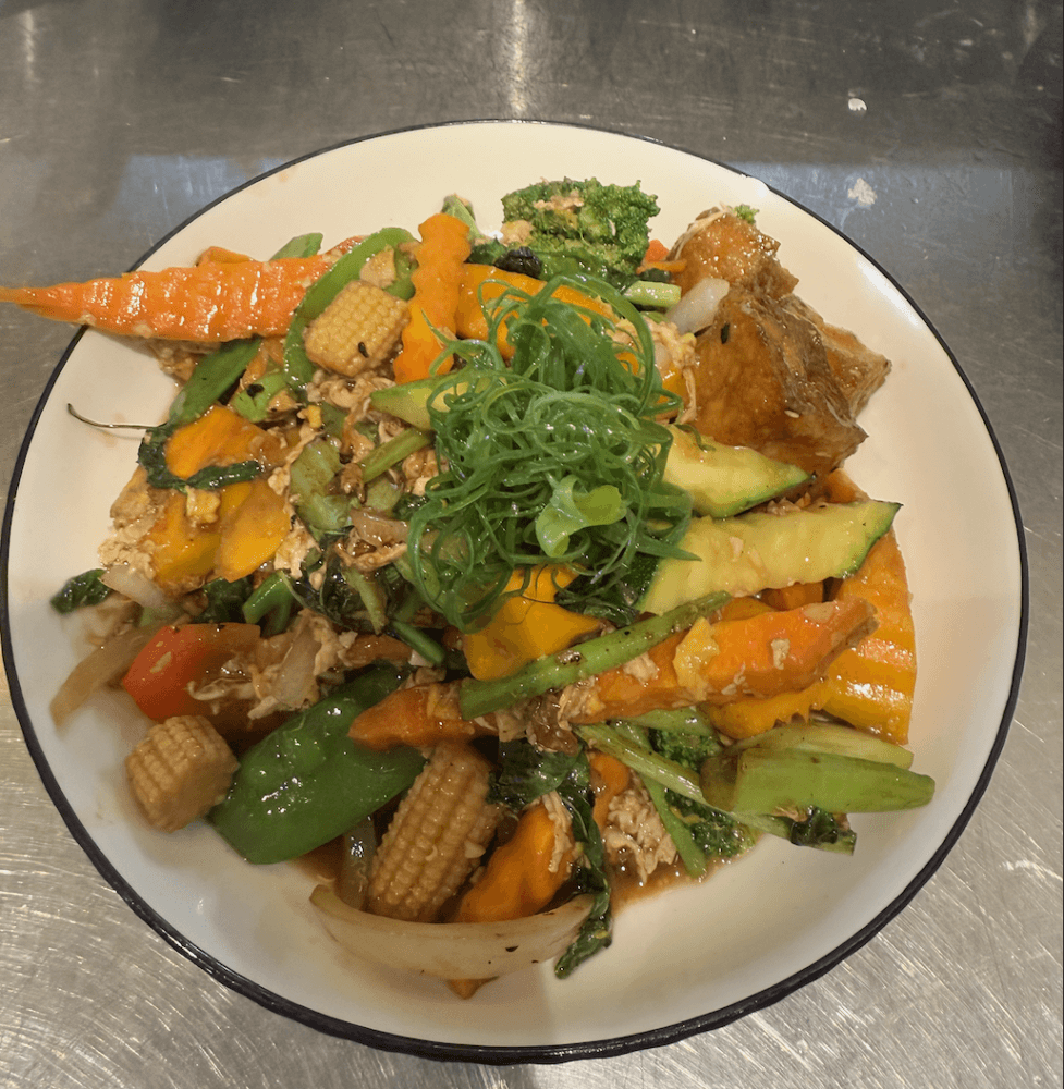 Stir-fried homemade sesame sauce, onion, garlic and mixed vegetable (GFO = Gluten free option available)