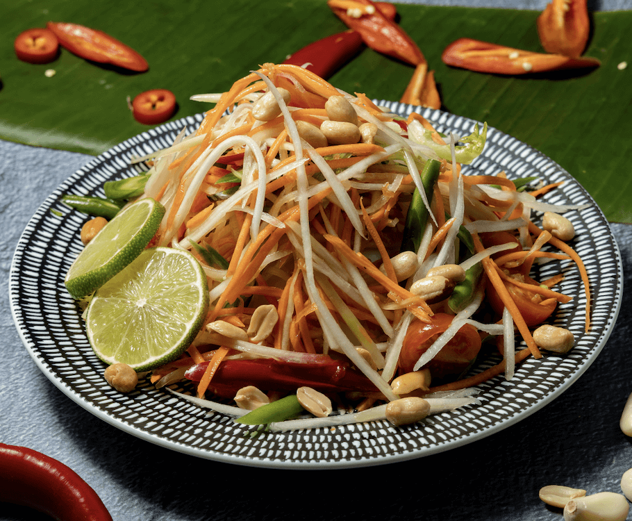 Green papaya with chilli, lemon, palm sugar, cherry tomato, green bean, carrot, peanut and dried shrimp