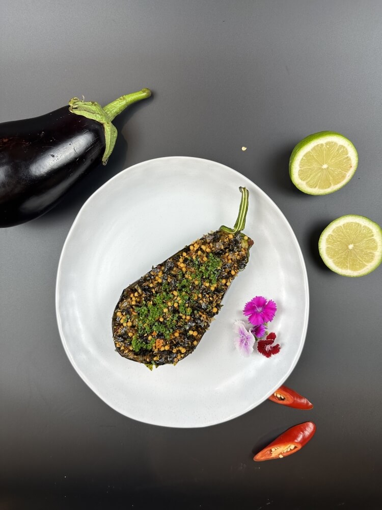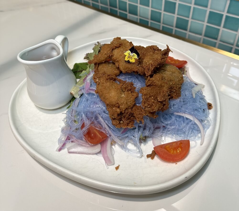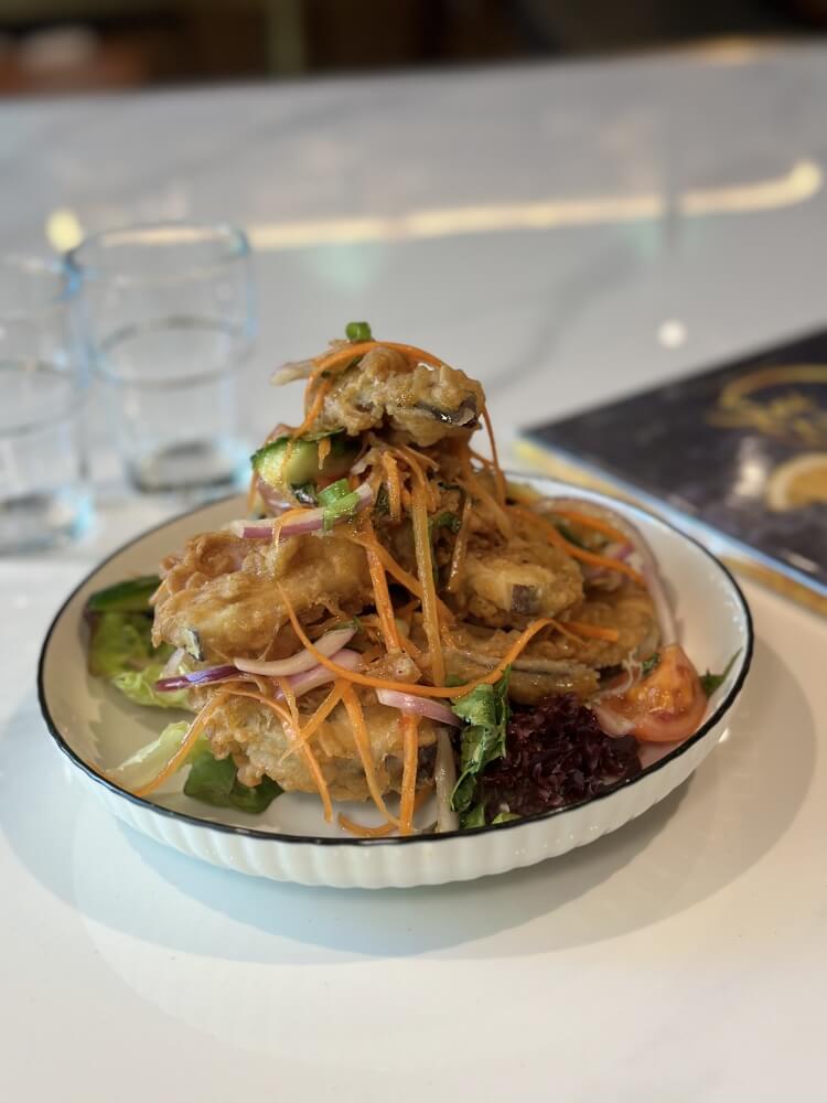 Crispy eggplant with red onion, mint, coriander, shallot, cherry tomato and Thai dressing