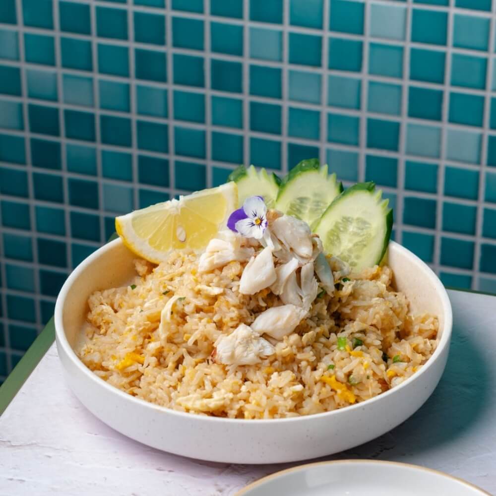 Thai-style fried rice with egg, crab meat, spring onion and garlic