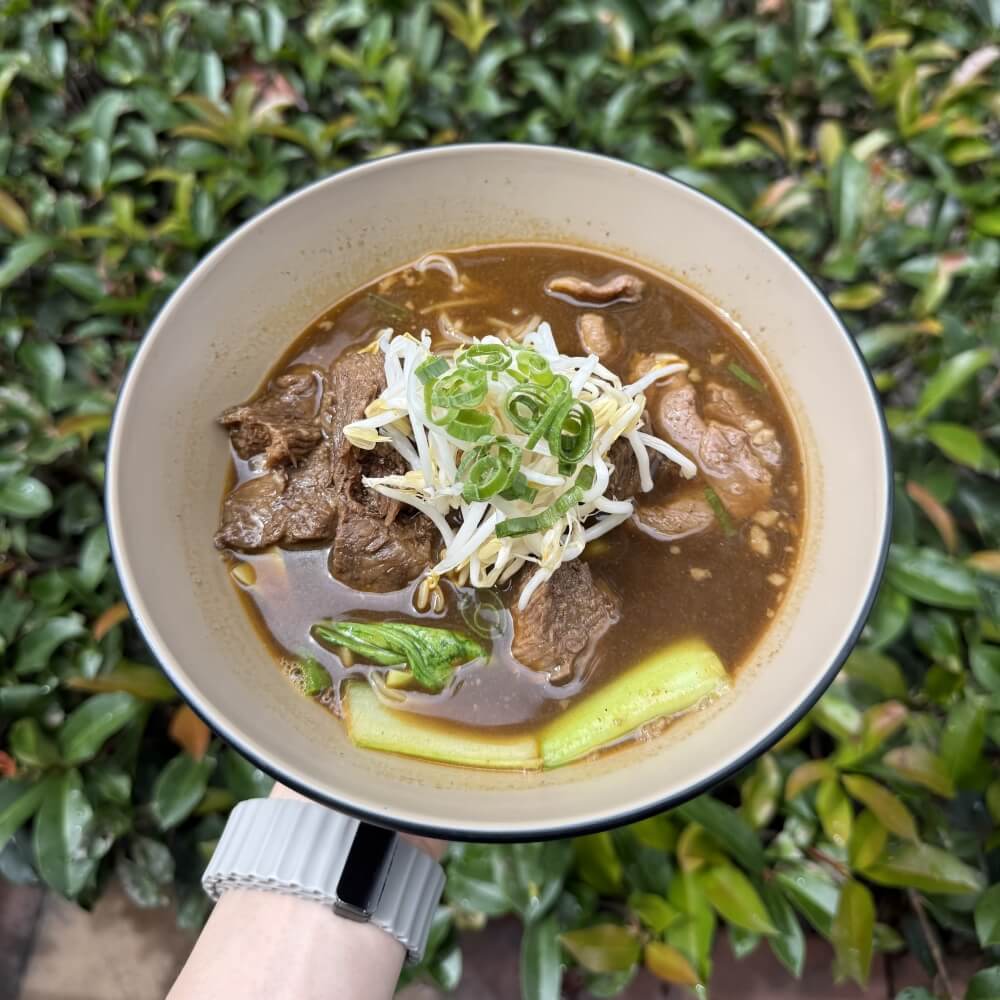 Braised beef and sliced beef with thin rice noodle, bok choy and bean sprouts