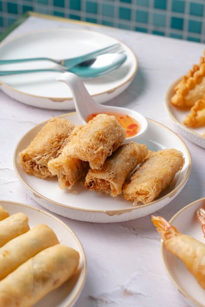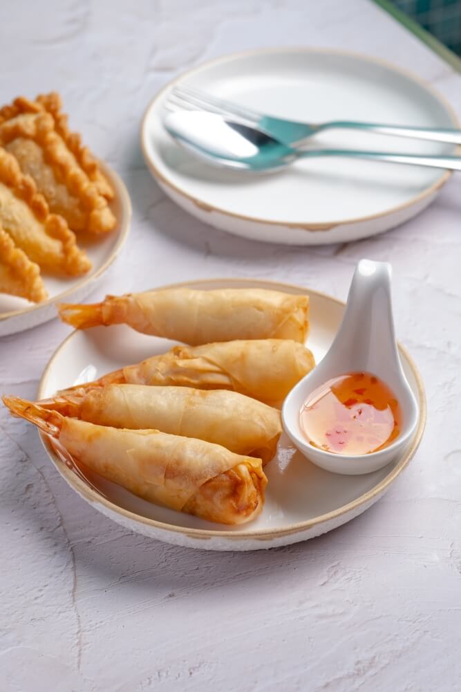Prawn-filled crispy golden net rice paper served with sweet chilli sauce
