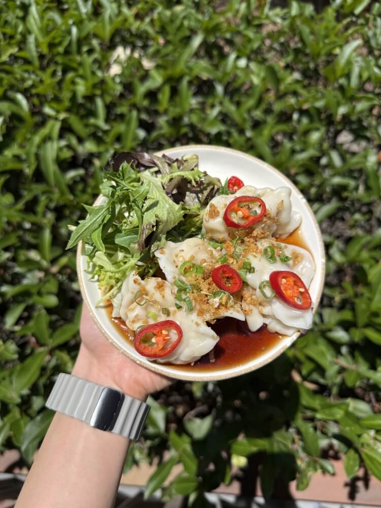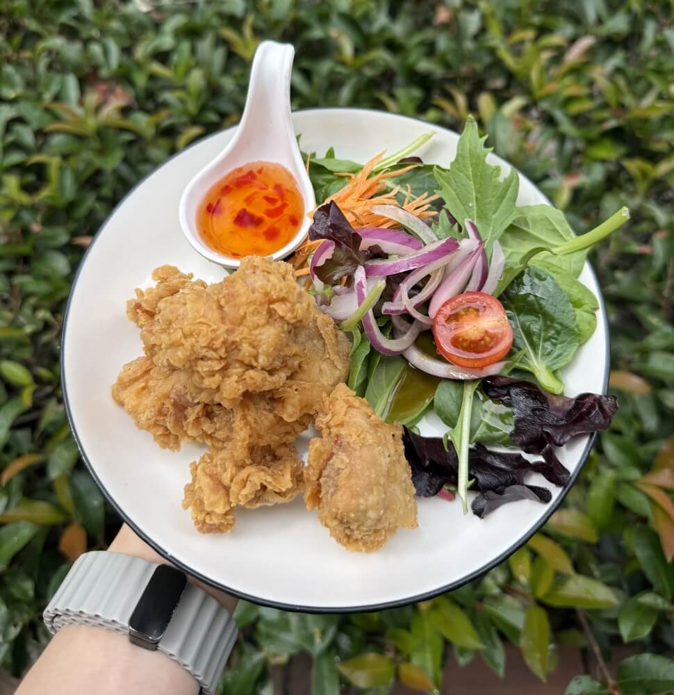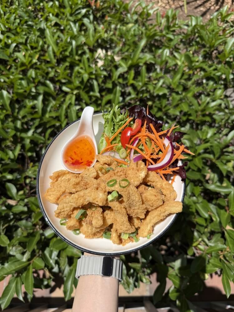 Panache mixed salad, crispy rice, pork sausage, red onion, roasted peanut, ginger and coriander with chilli jam dressing