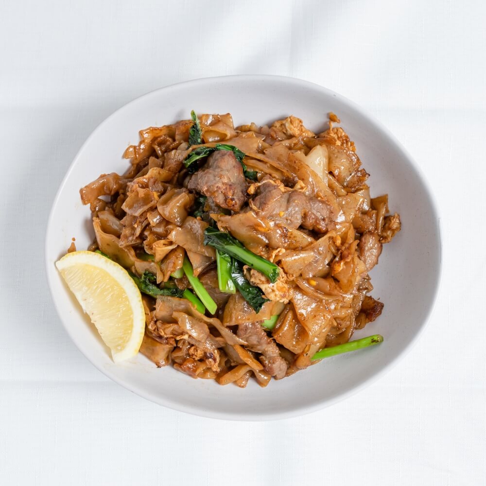 Stir-fried flat rice noodle with egg, Chinese broccoli, soy and oyster sauces (GFO = Gluten free option available with thin rice noodle)