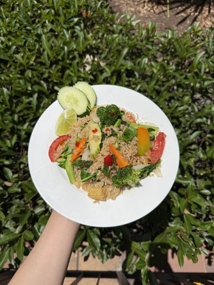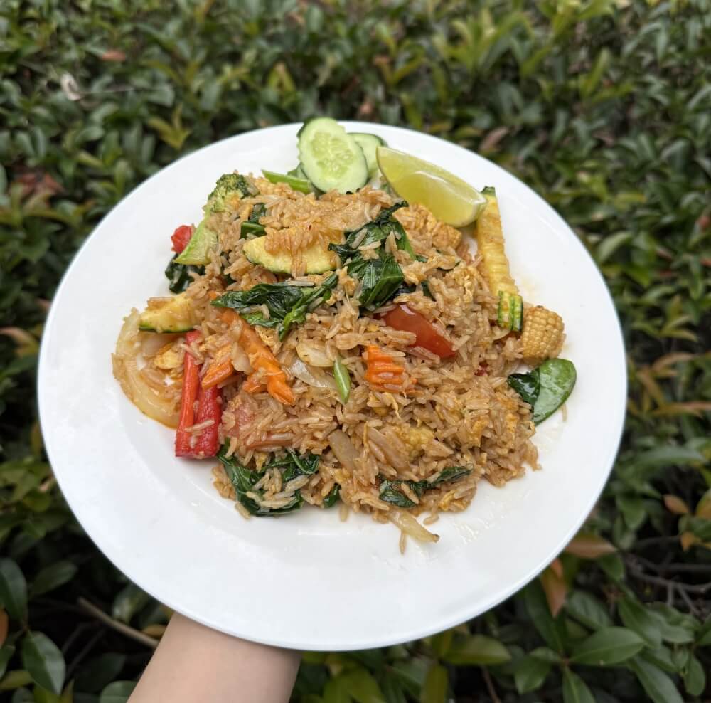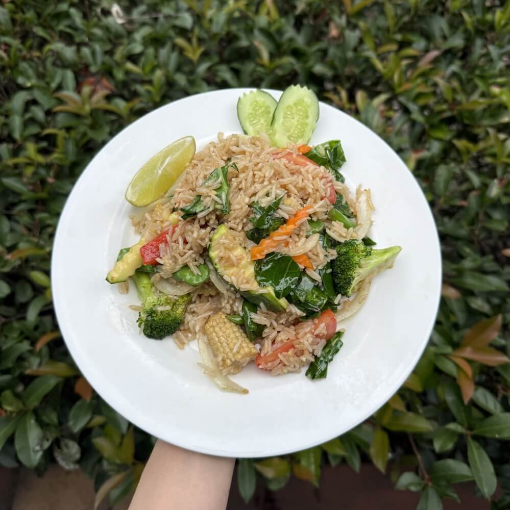 Thai-style fried rice with chilli, basil, egg, tomato, onion, garlic and Chinese broccoli