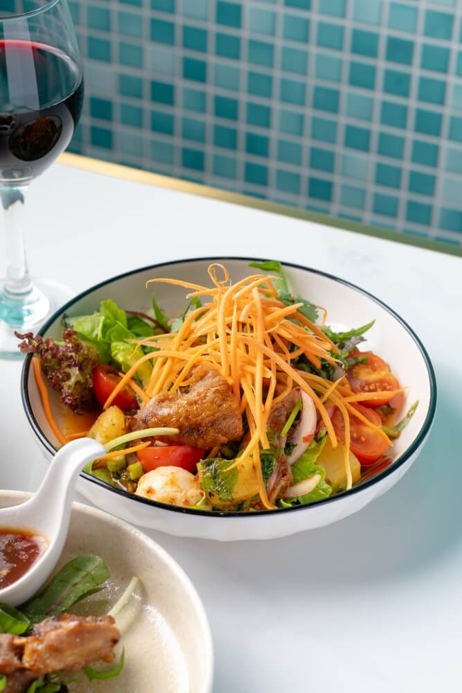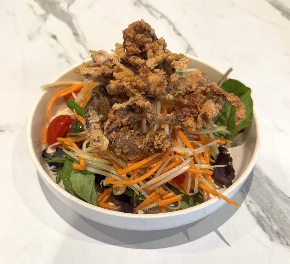 Green papaya chilli, lemon, palm sugar, cherry tomato, green bean, carrot, peanut and dry shrimp with crispy soft shell crab