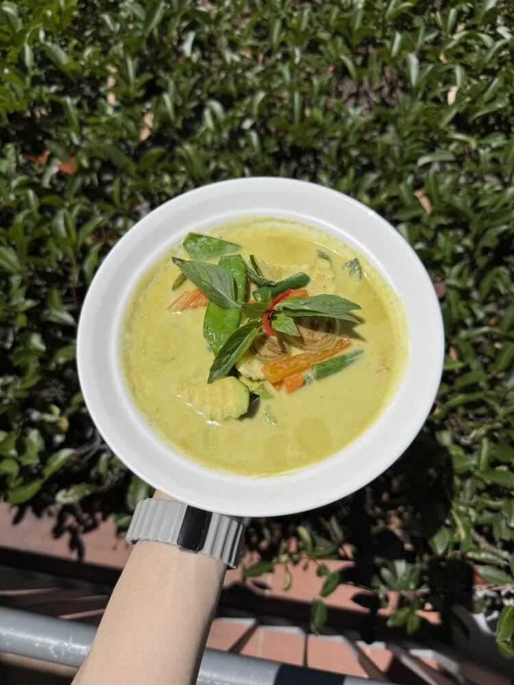 Thai green curry with apple eggplant, mixed vegetables, green bean, chilli and basil