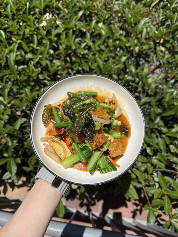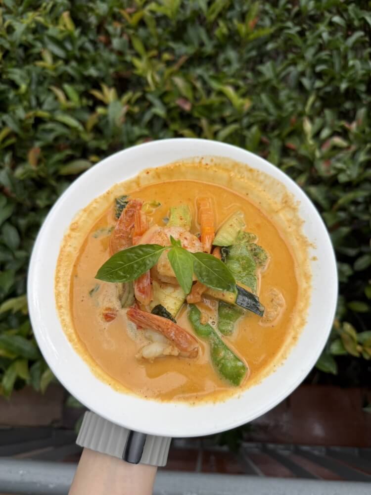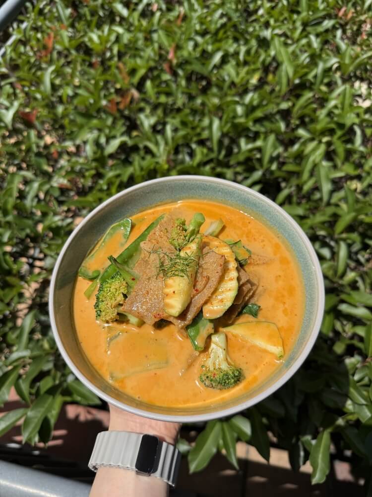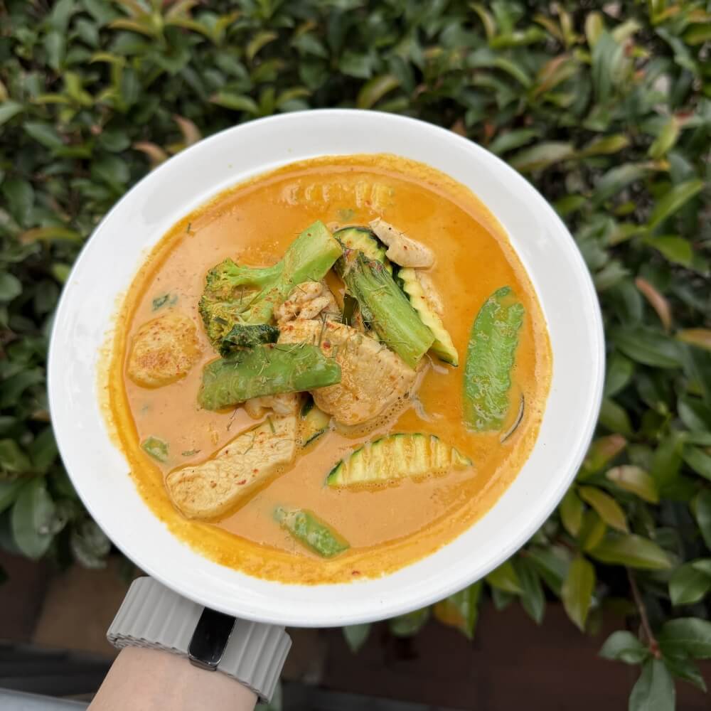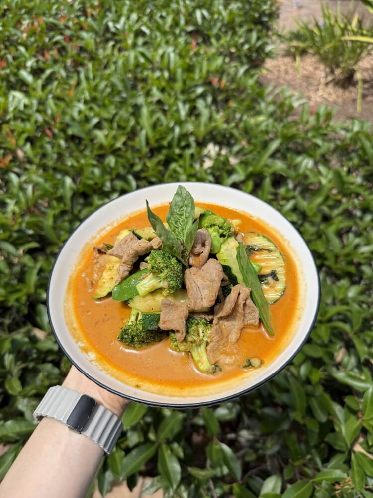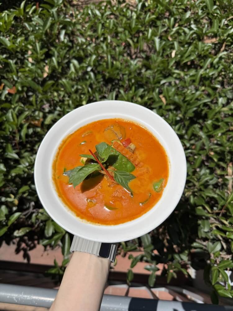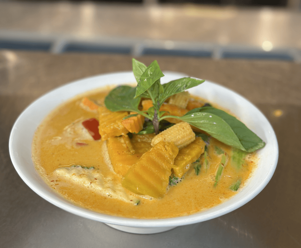 Thai Red curry with apple apple eggplant, mixed vegetables, green bean, chilli and basil