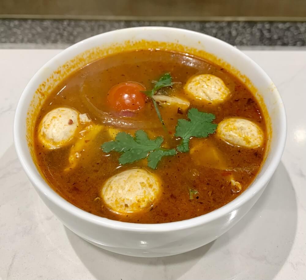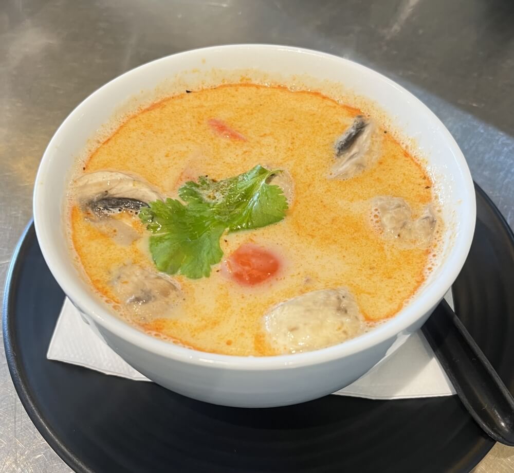 Thai coconut soup with galangal, kaffir lime leaves, coriander, mushroom and tomato