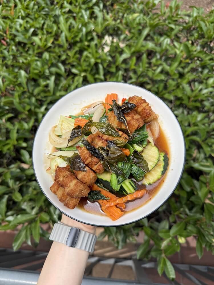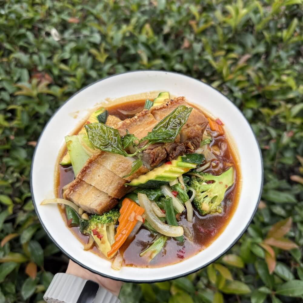 Crispy pork belly, green bean, chilli, garlic, basil, mixed vegetables and oyster sauce (GFO = Gluten free option available)