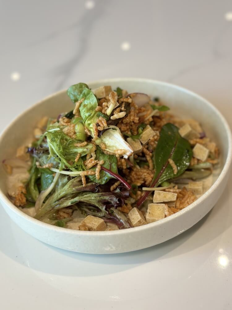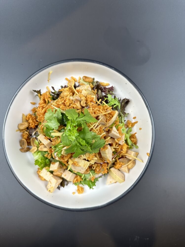 Panache mixed salad, crispy rice, tofu, red onion, roasted peanut, ginger and coriander with Thai dressing
