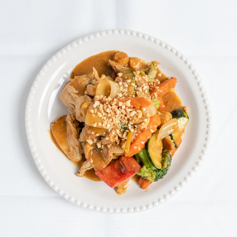 Stir-fried with homemade peanut sauce, mixed vegetables, onion and garlic