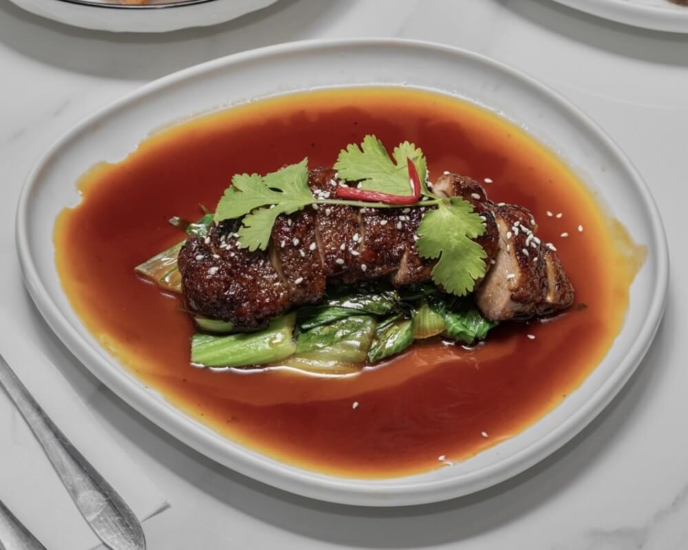 Roasted duck fillet stir fried with sweet and spicy chilli sauce, ginger and, garlic served on a bed of steamed Asian green