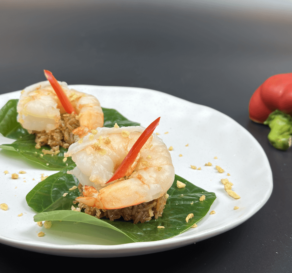 Crushed roasted peanut sprinkled over prawn, lime zest, red onion, ginger, coconut relish served on betel leaf