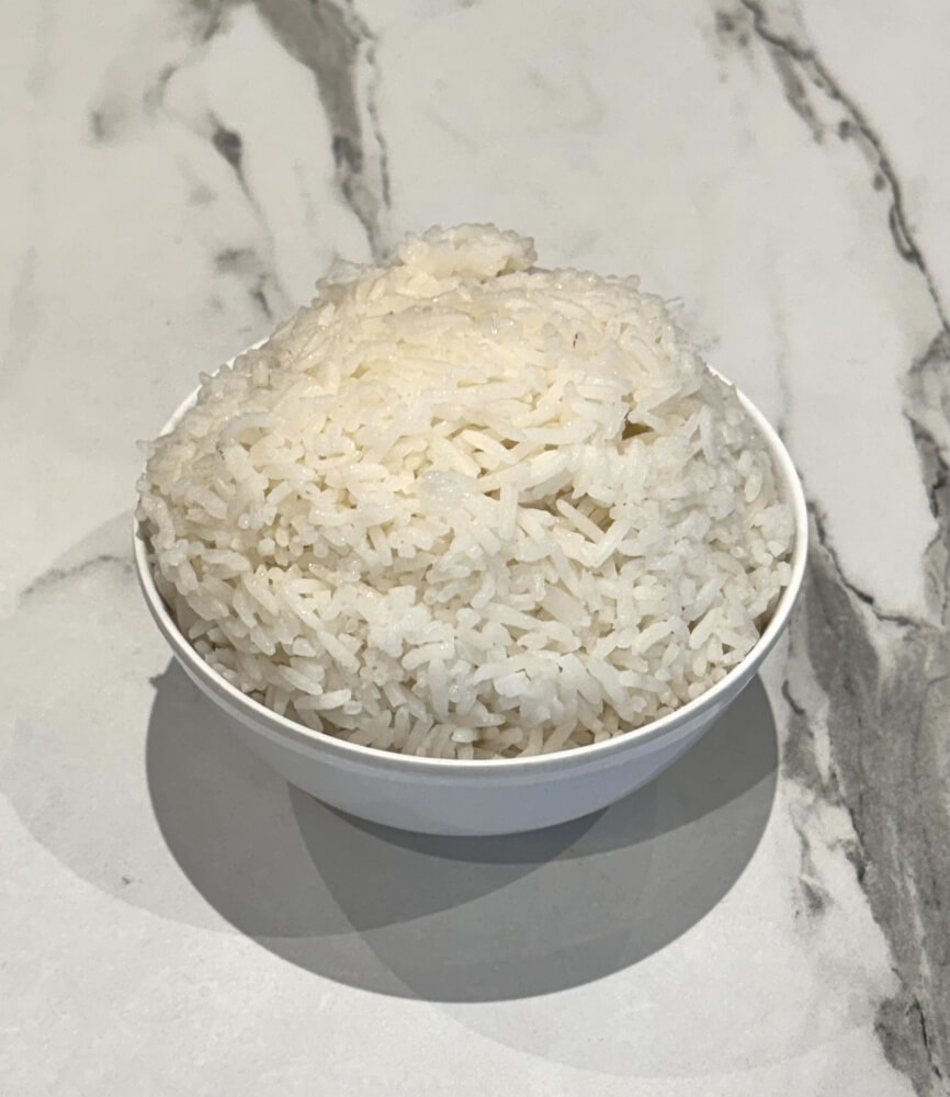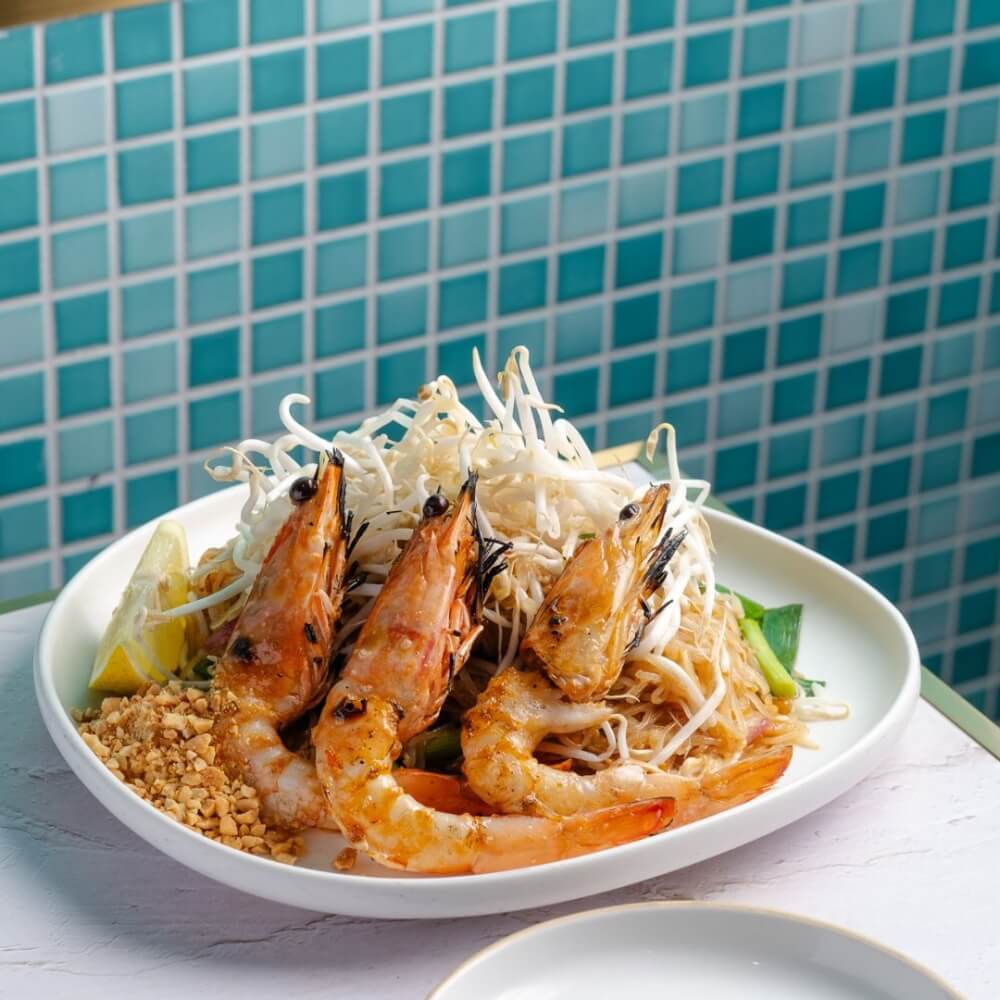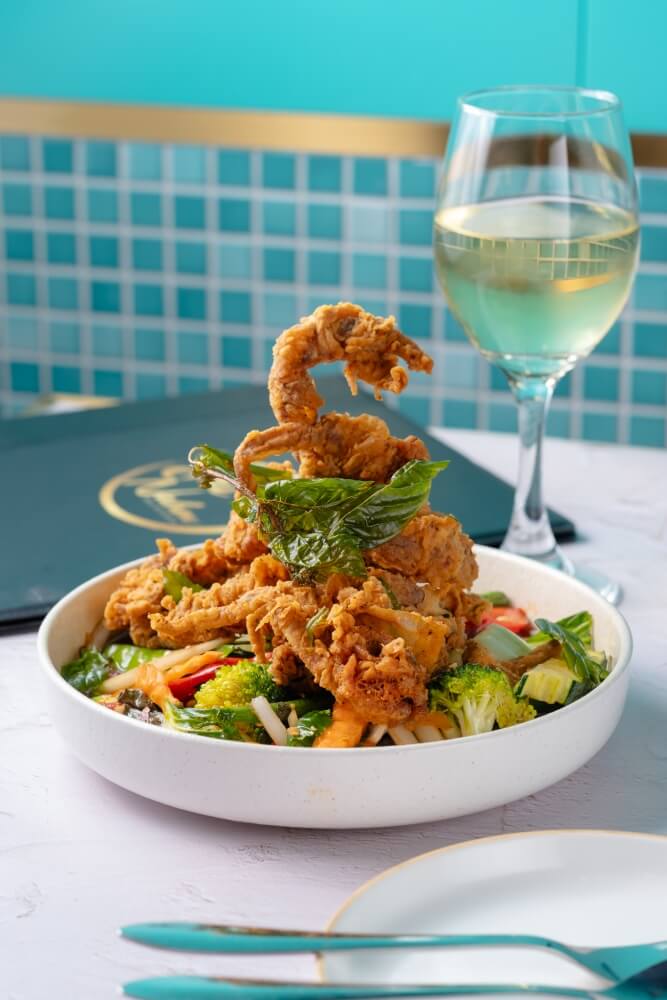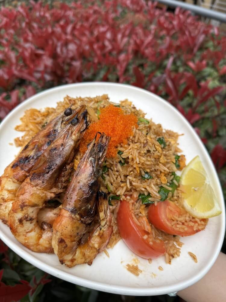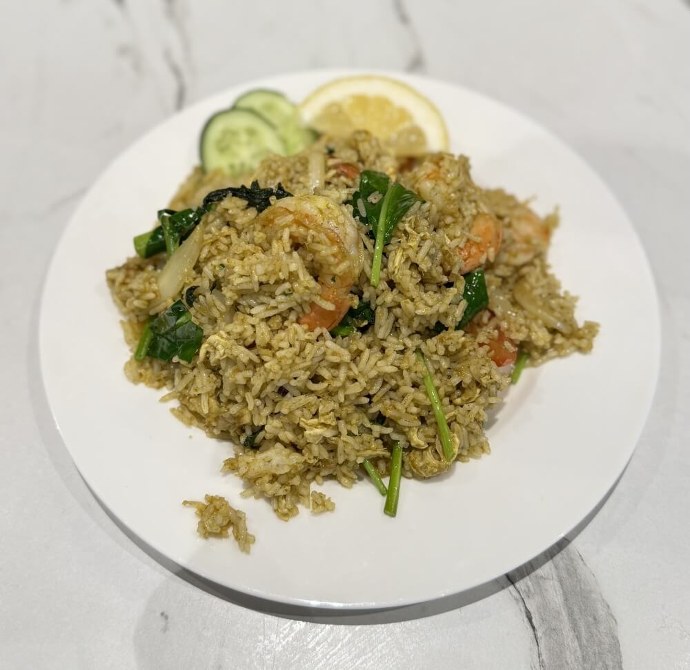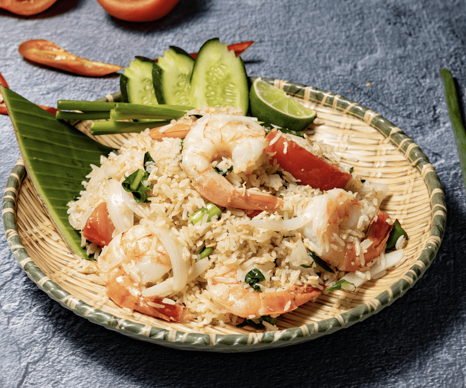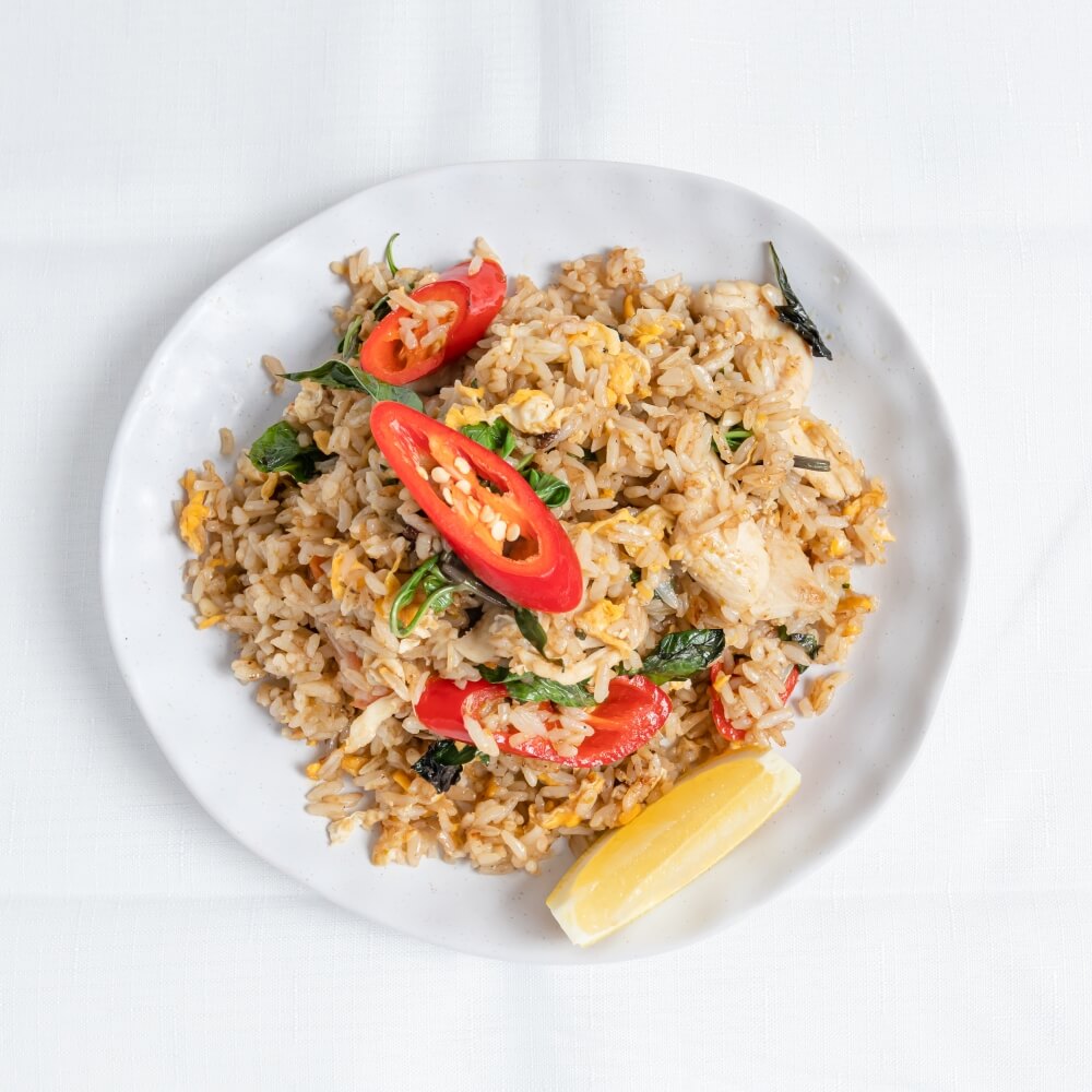 Thai fried rice infused with rich shrimp oil, king prawn and Chinese broccoli