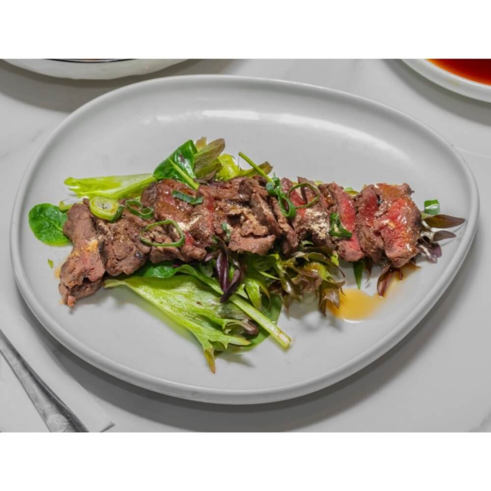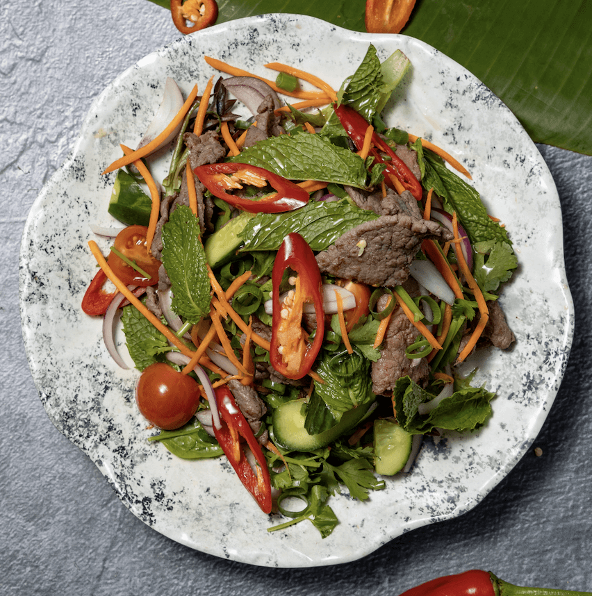 Grilled marinated beef with red onion, mint, cherry tomato, coriander and Thai dressing