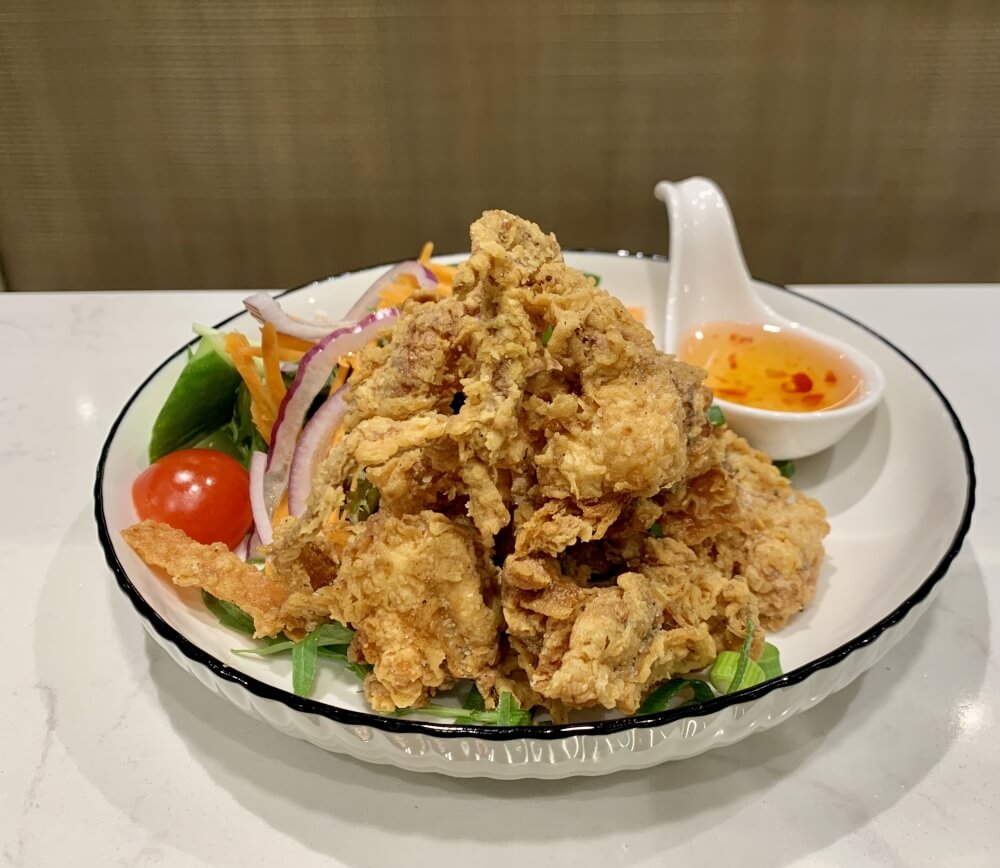 Whole crispy salt and pepper barramundi served with a side of Thai dressing