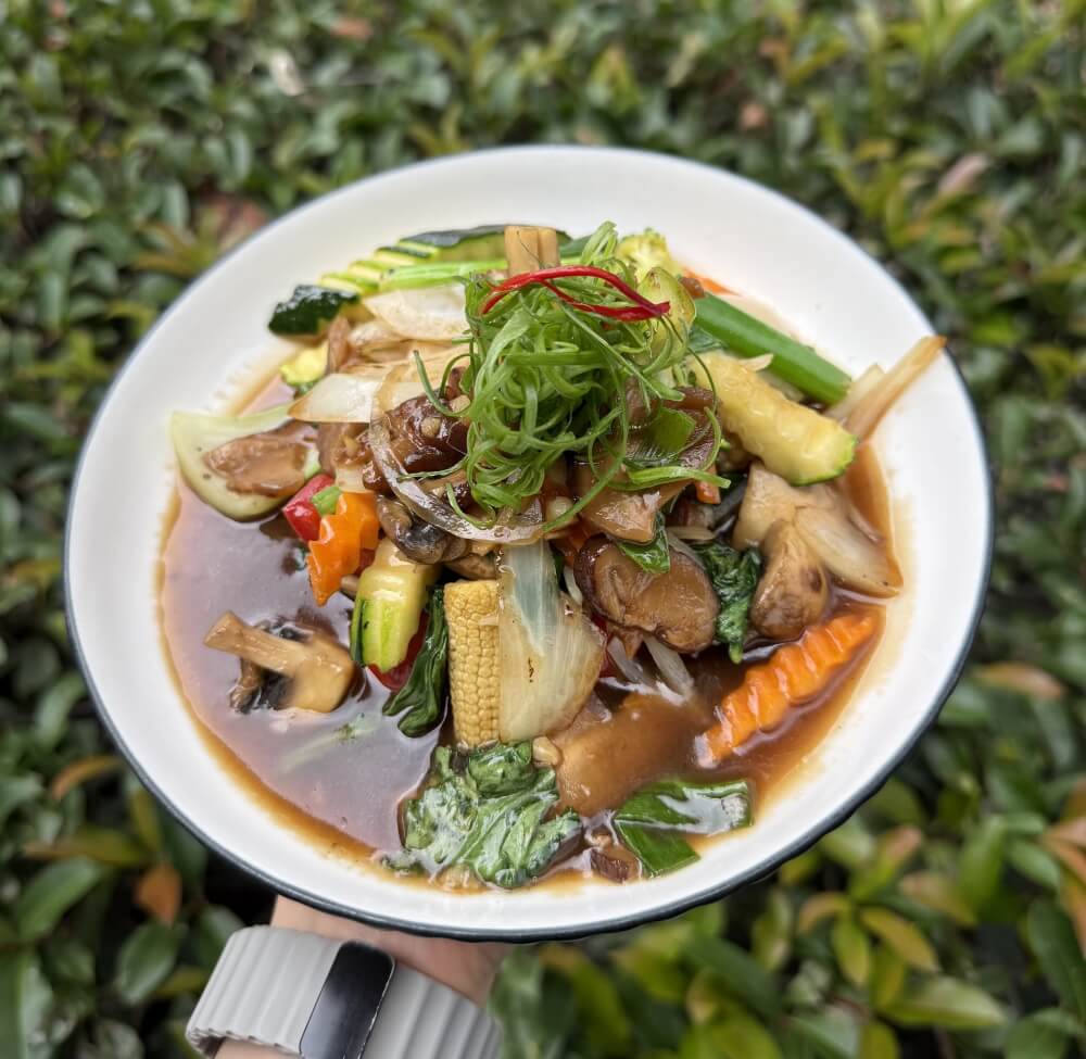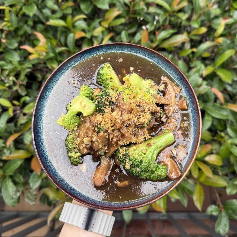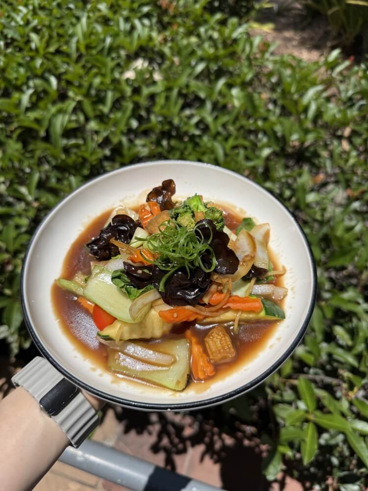 Stir-fried shiitake mushroom, carrot, corn, vegan oyster sauce, shallot, garlic and onion