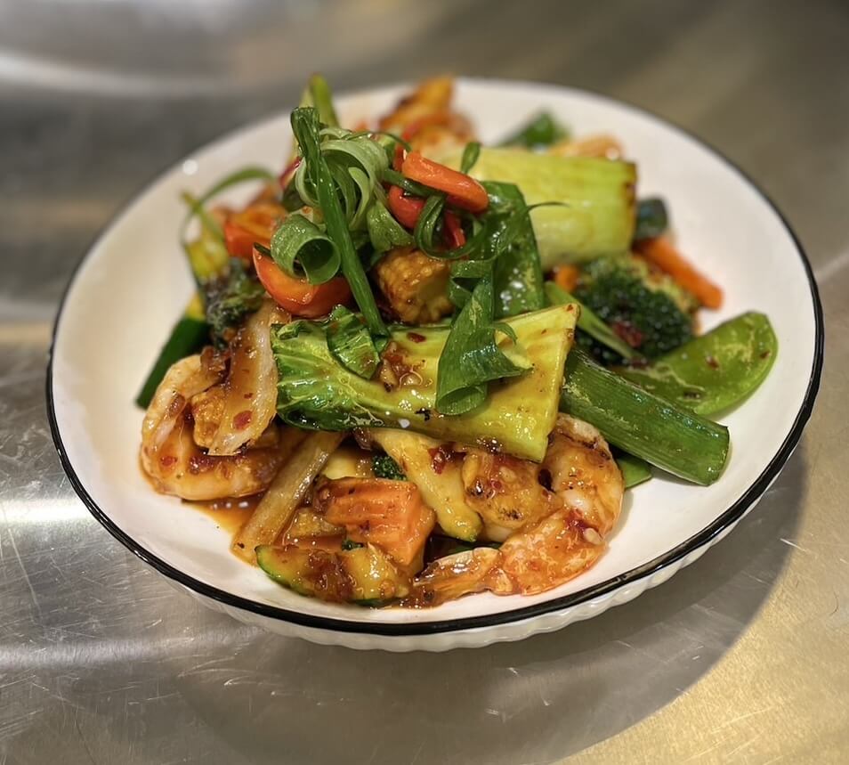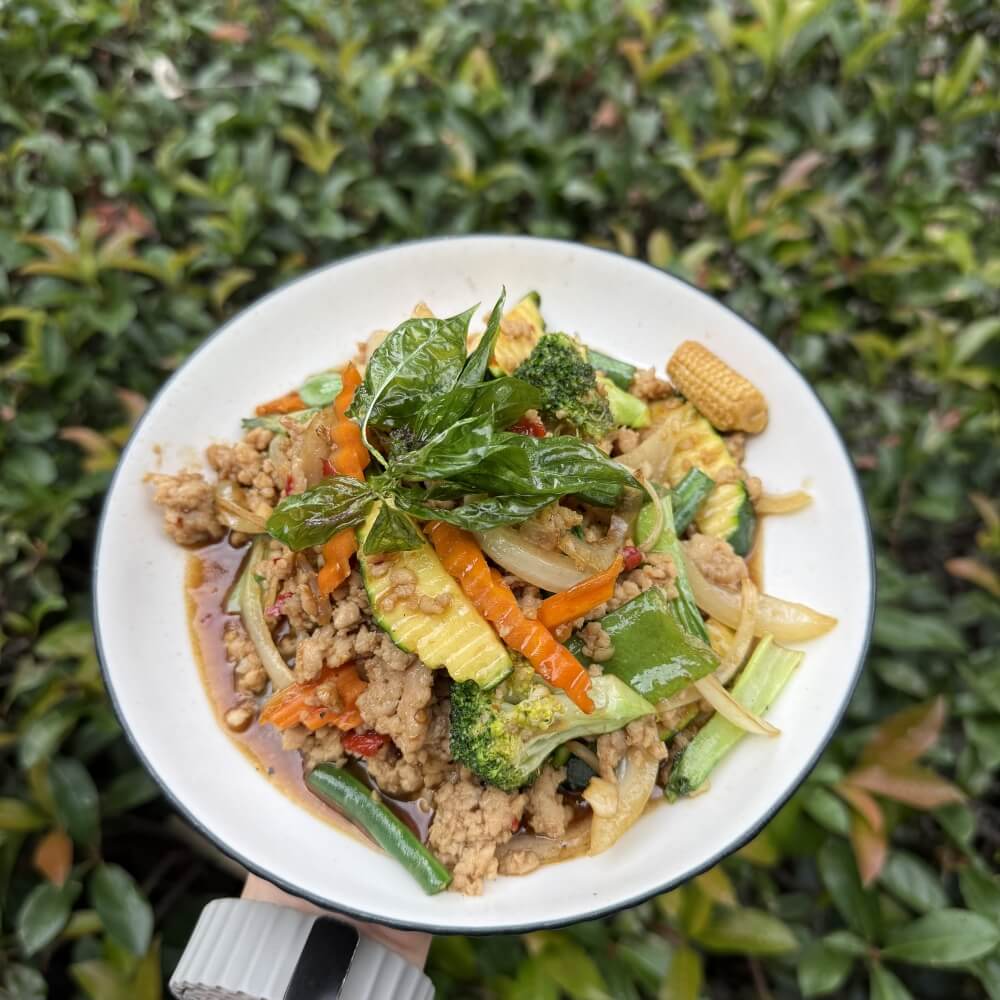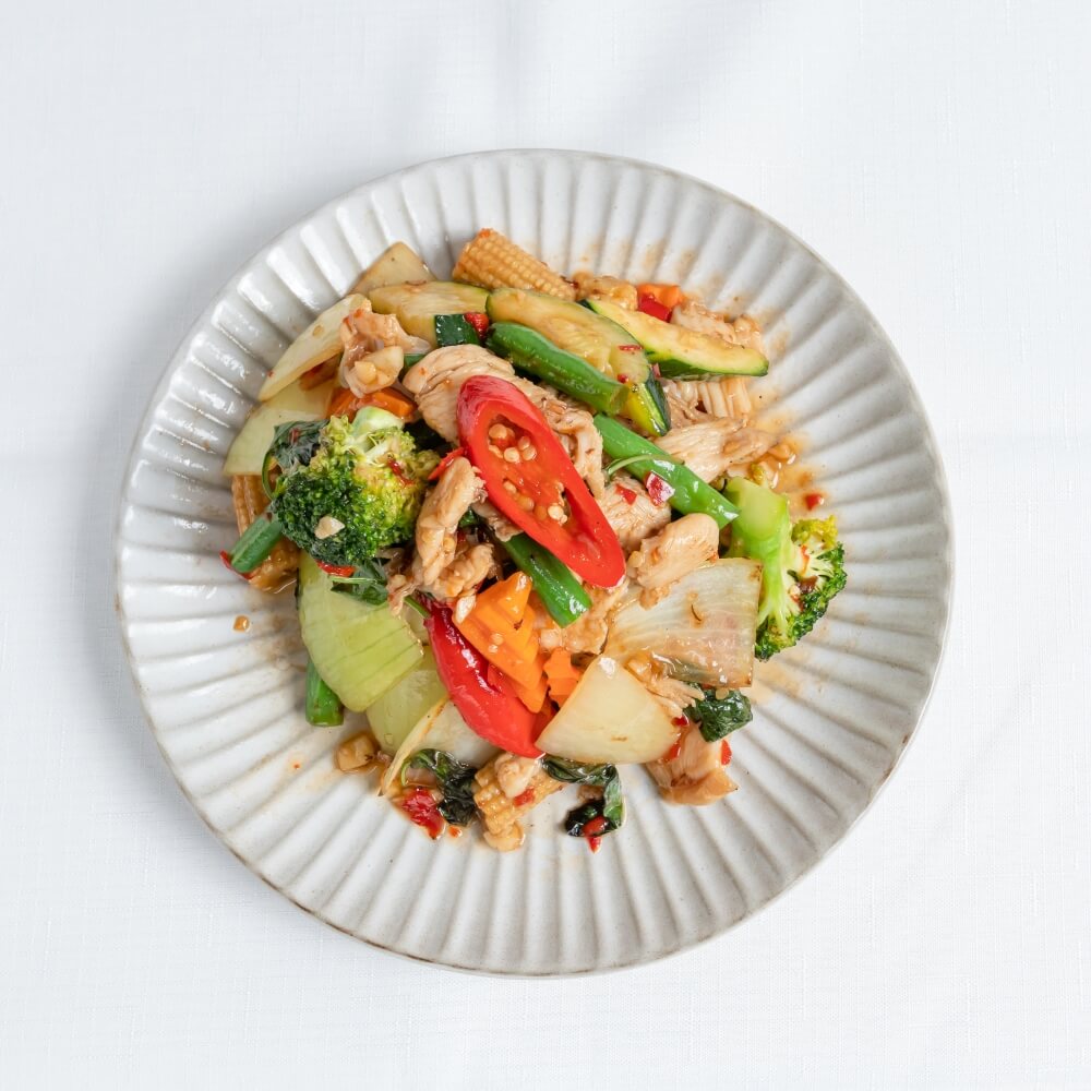 Stir-fried with basil, onion, garlic, mixed vegetables and chilli