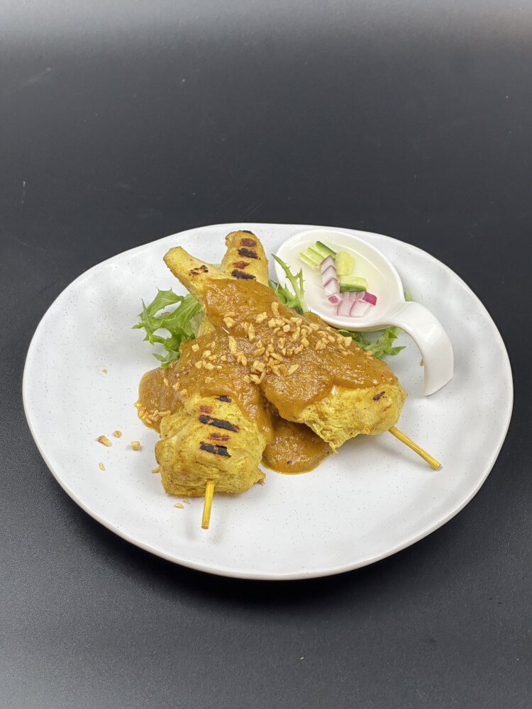 Grilled marinated chicken tenderloin skewers garnished with peanut sauce