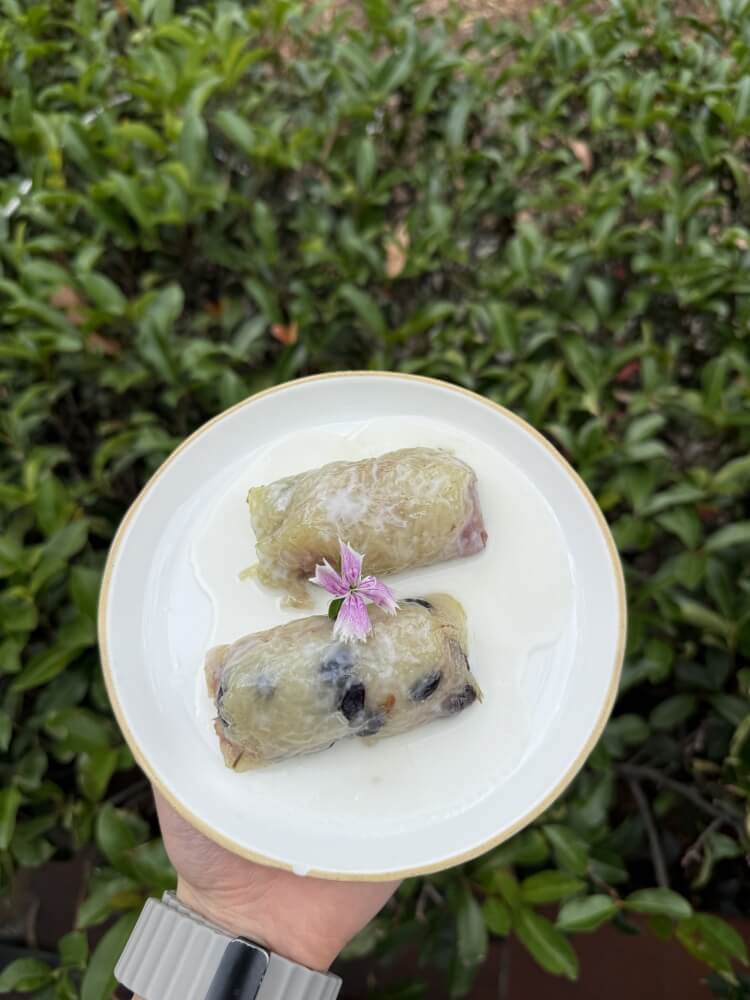 Sweet sticky rice cooked with ripe banana and coconut milk, wrapped and gently steamed