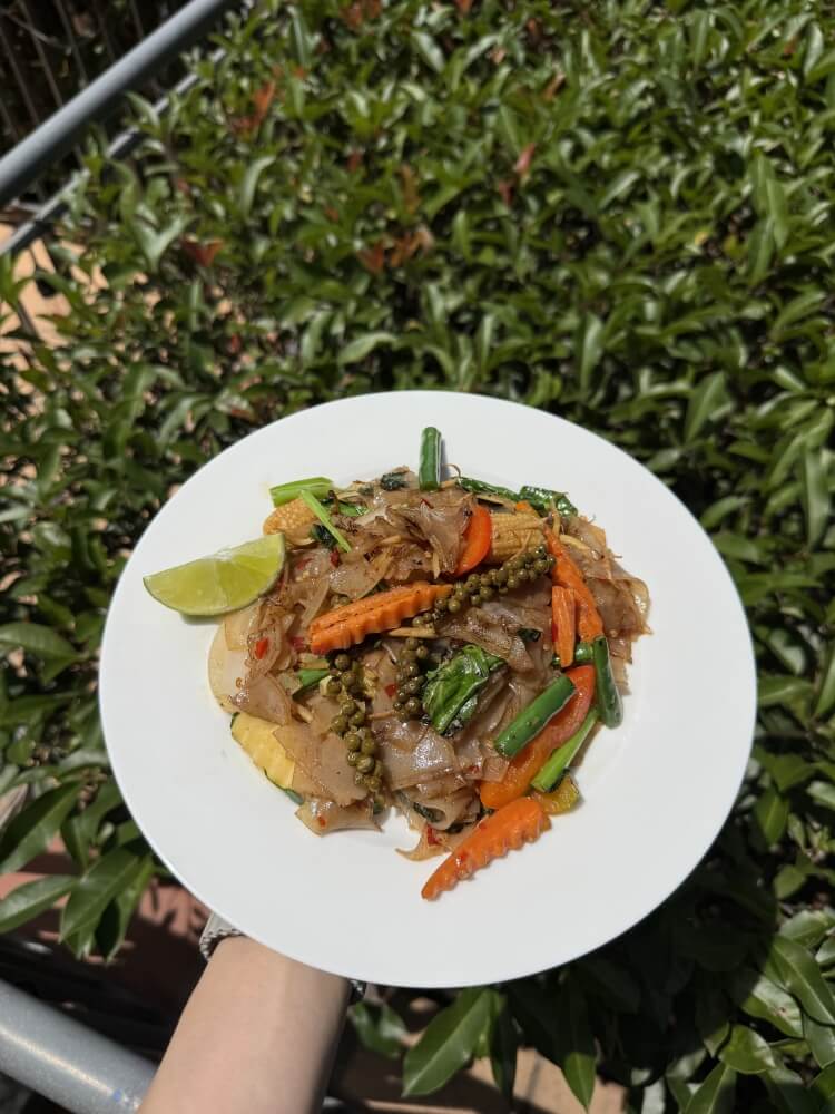 Stir-fried flat rice noodle with Chinese broccoli, chilli, green peppercorn, rhizome, basil and dark soy sauce