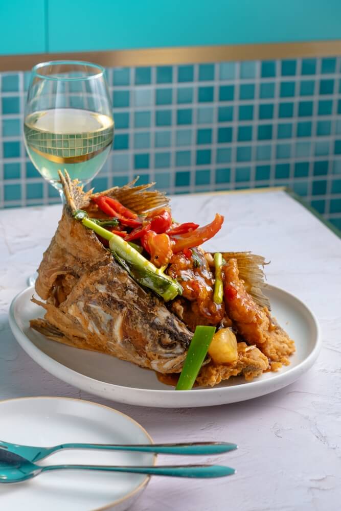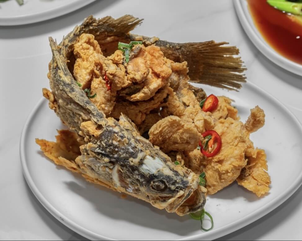 Whole crispy barramundi, pineapple, garlic and tomato sauce
