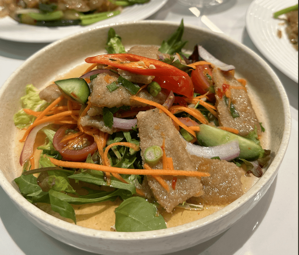 Vegan duck with lychee, pineapple, mint, coriander, cherry tomato, shallot and Thai dressing