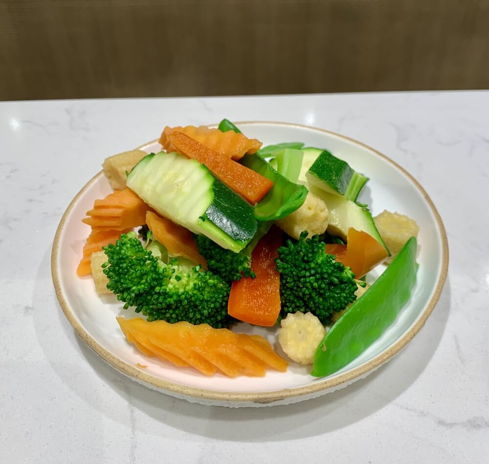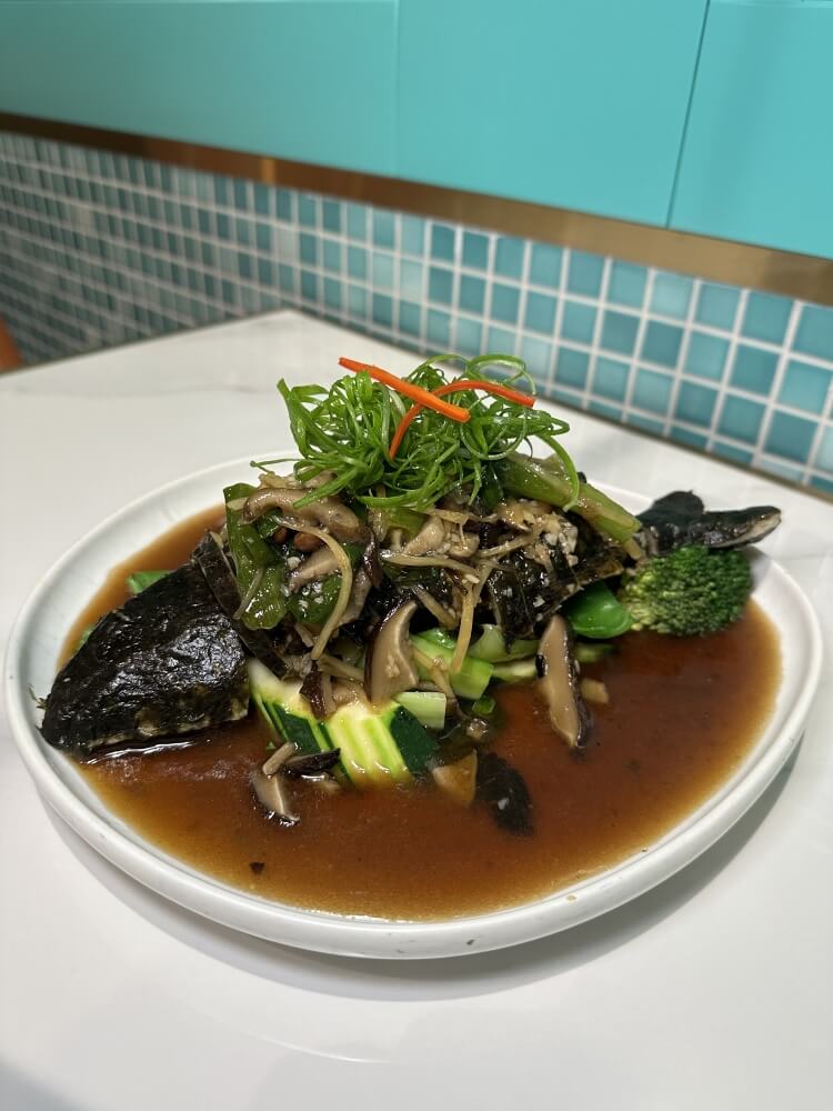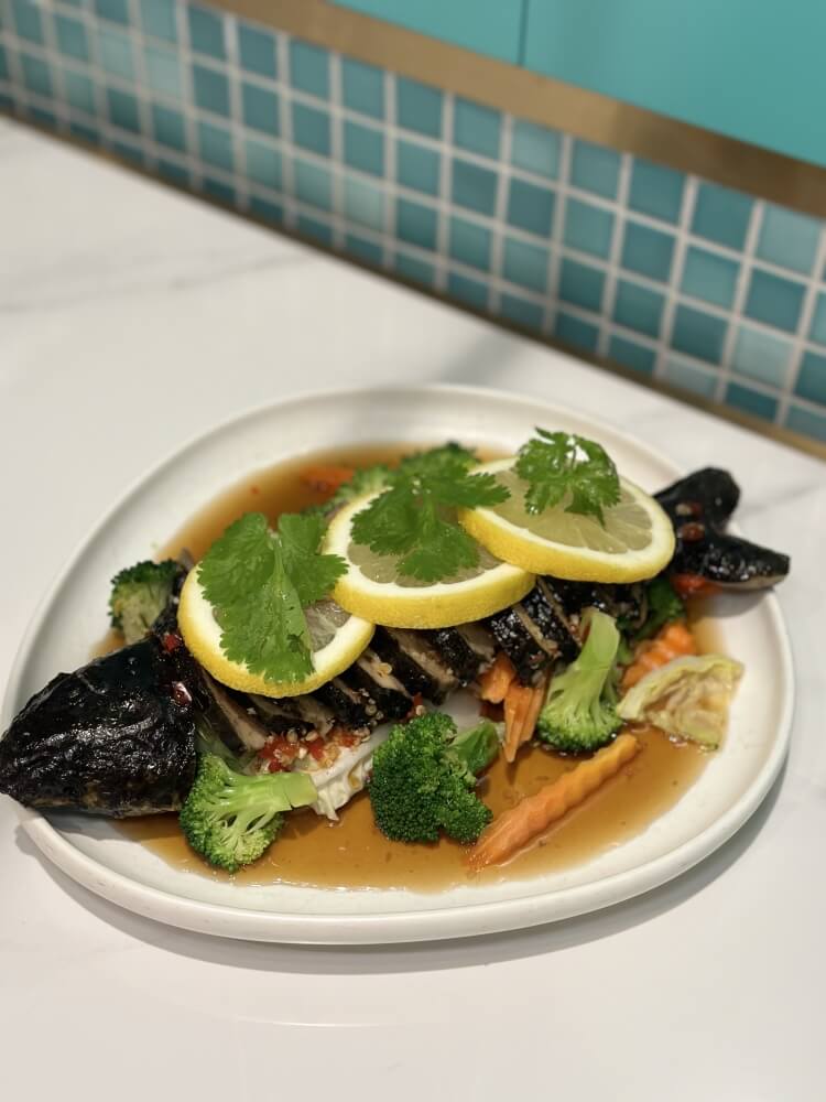 Steamed barramundi fillet in spicy lemon dressing sauce served with Chinese cabbage, carrot and broccoli
