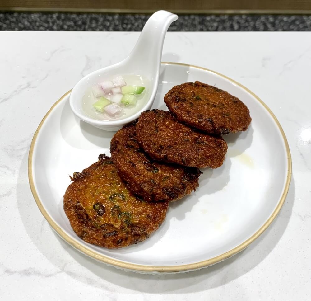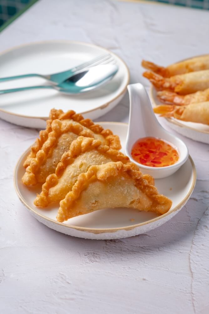 Gloden pastry filled with curried potato, corn and pea served with sweet chilli sauce