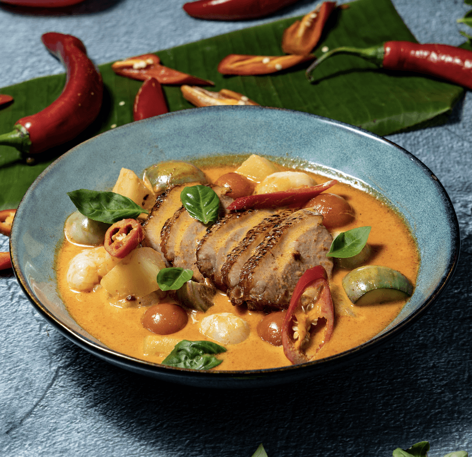 Red curry with roasted duck, lychee, apple eggplant, pineapple, cherry tomato, vegetables, shrimp paste and kaffir lime leaves