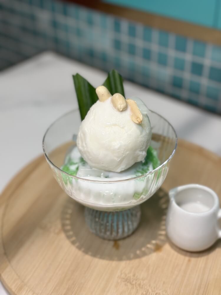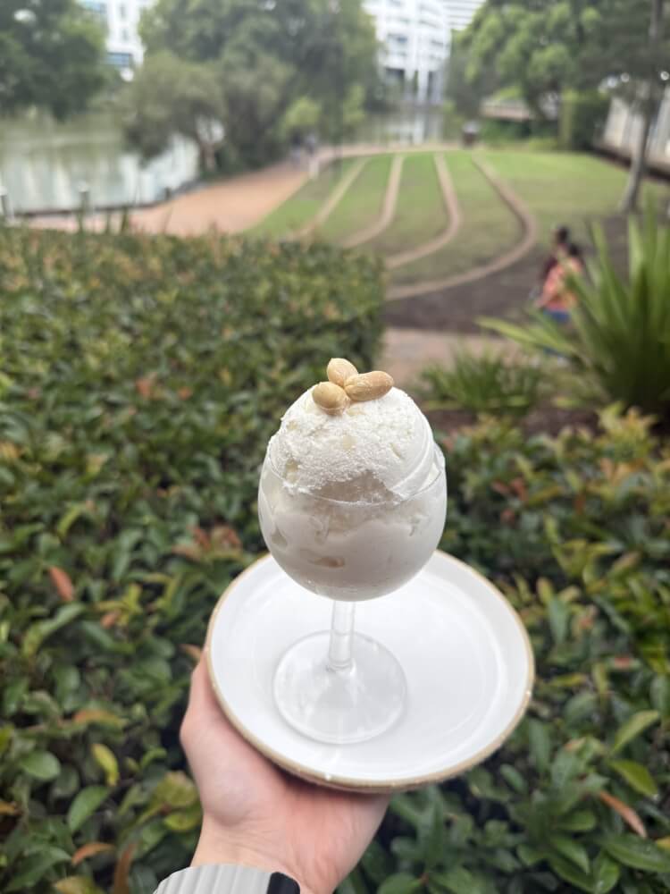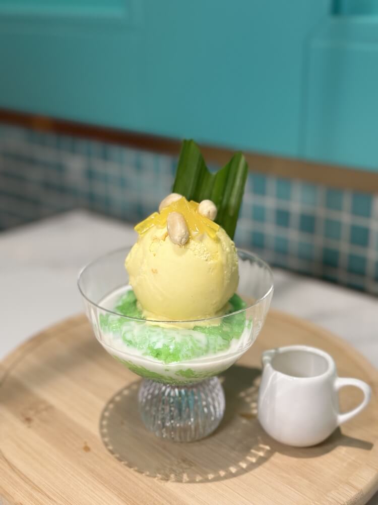Mango ice cream with sweet sticky rice, coconut cream, jelly and peanut