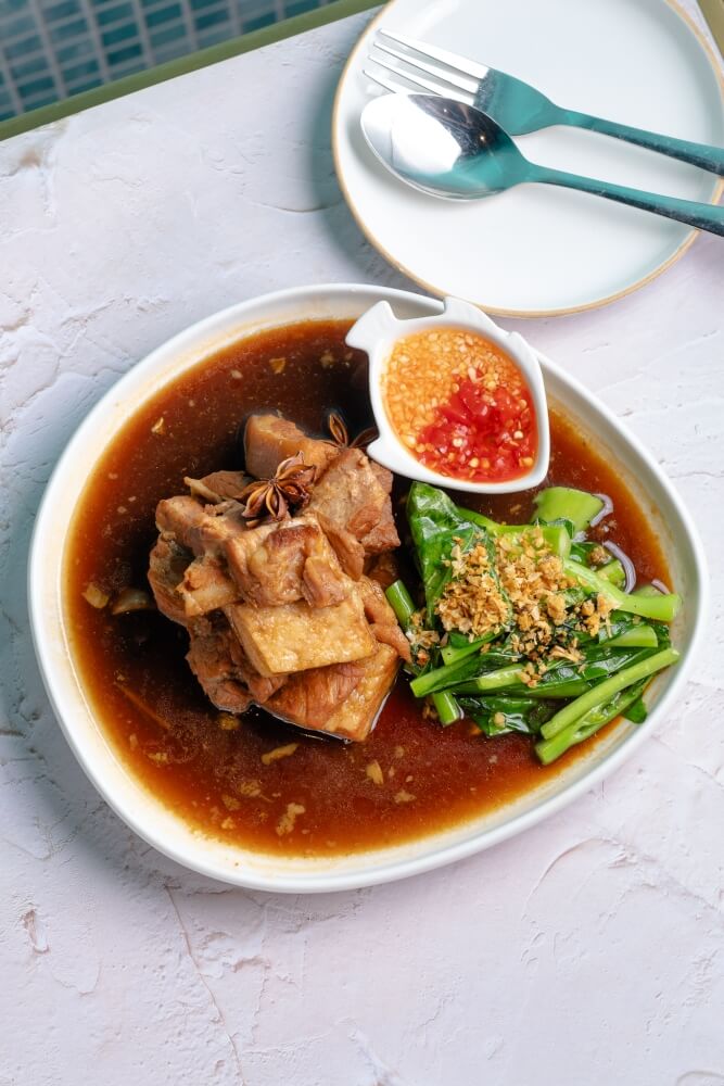 Pork belly cooked with caramel palm sugar, five spice served with stir-fried Chinese broccoli