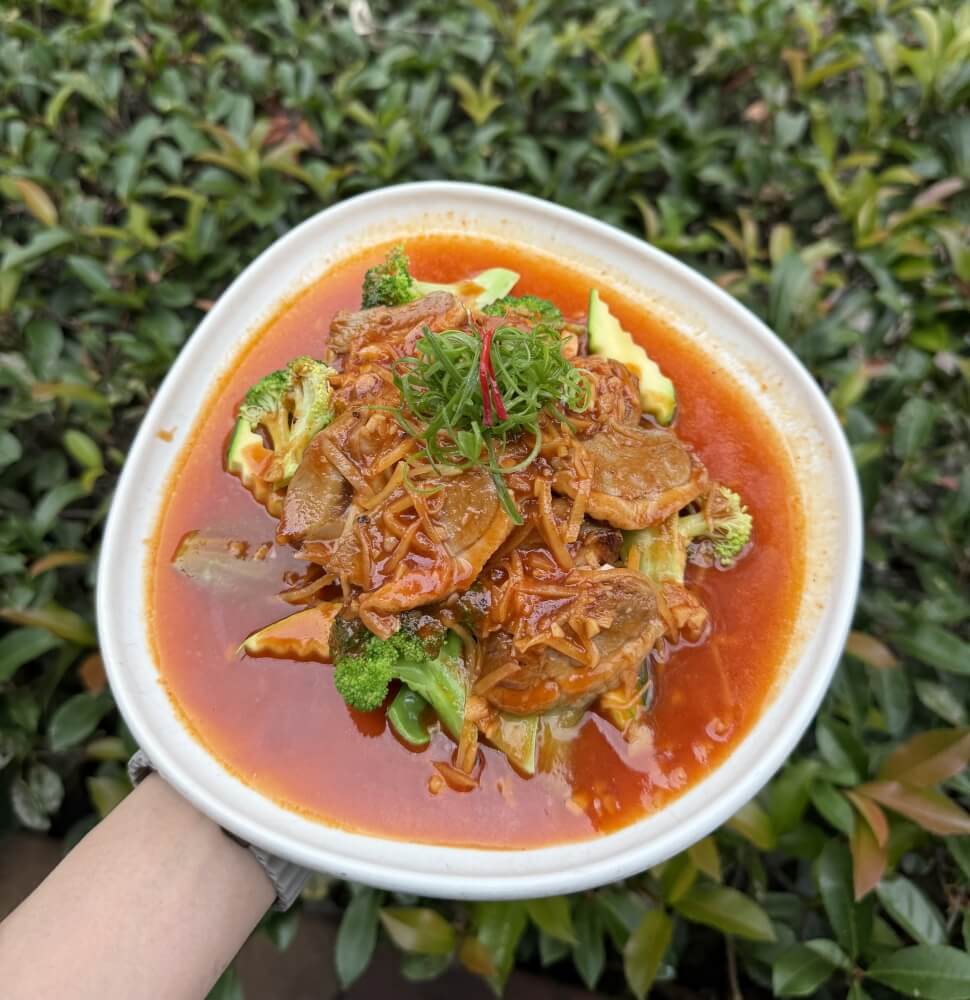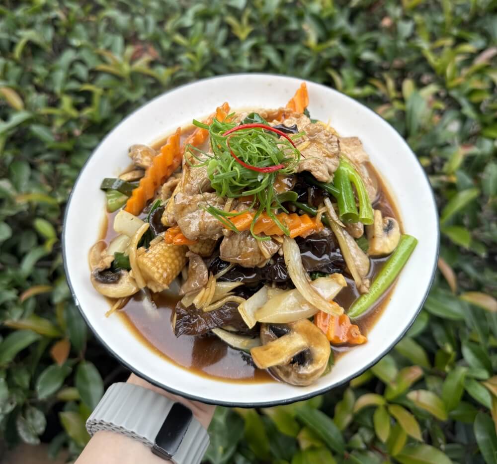 Stir-fried with fresh ginger, onion, garlic, mixed vegetables, black fungus and mushroom (GFO = Gluten free option available)