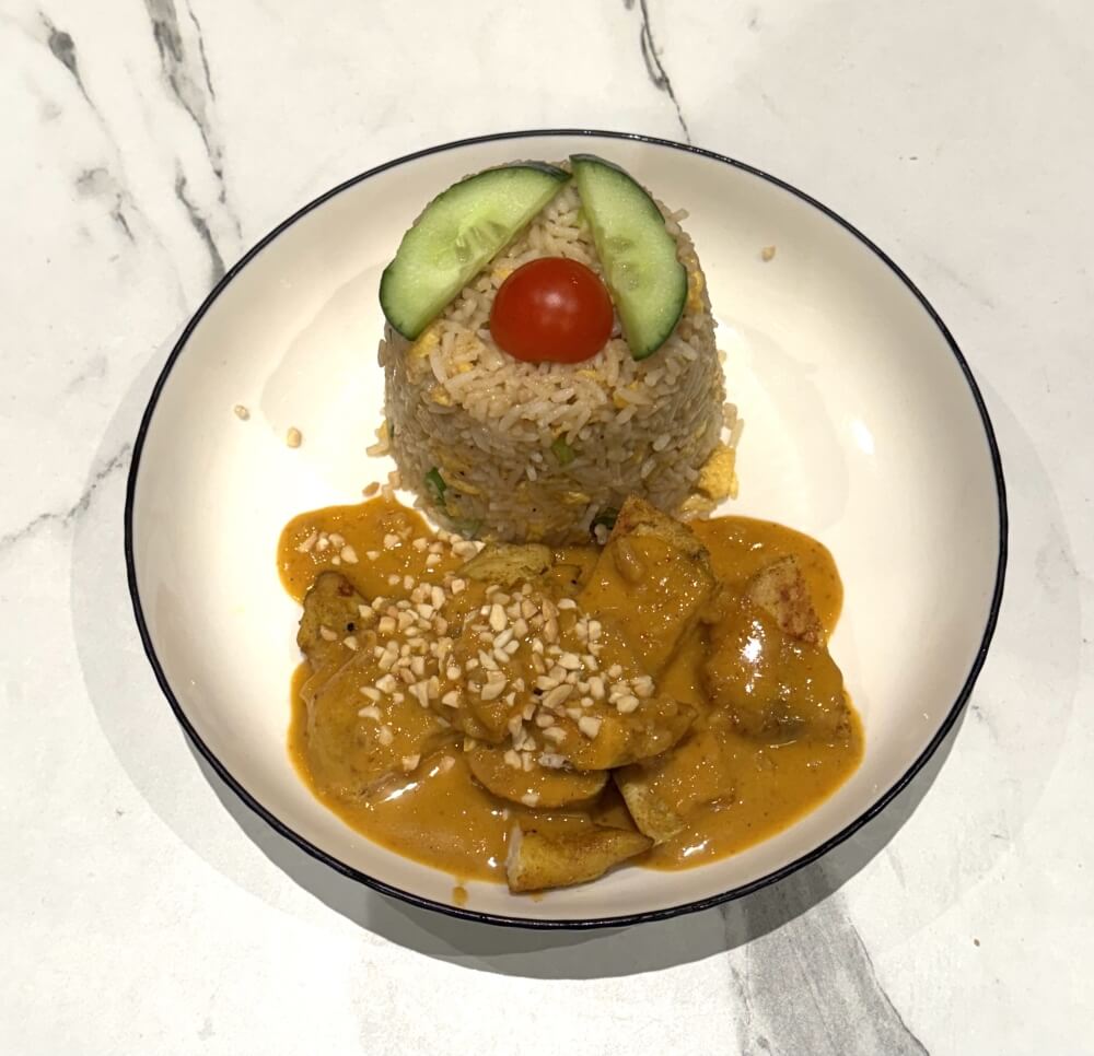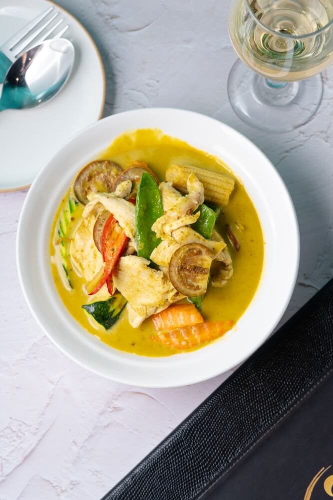 Sliced soy, aromatic Choo-chee curry paste cream, coconut cream, green vegetables and kaffir lime leaves