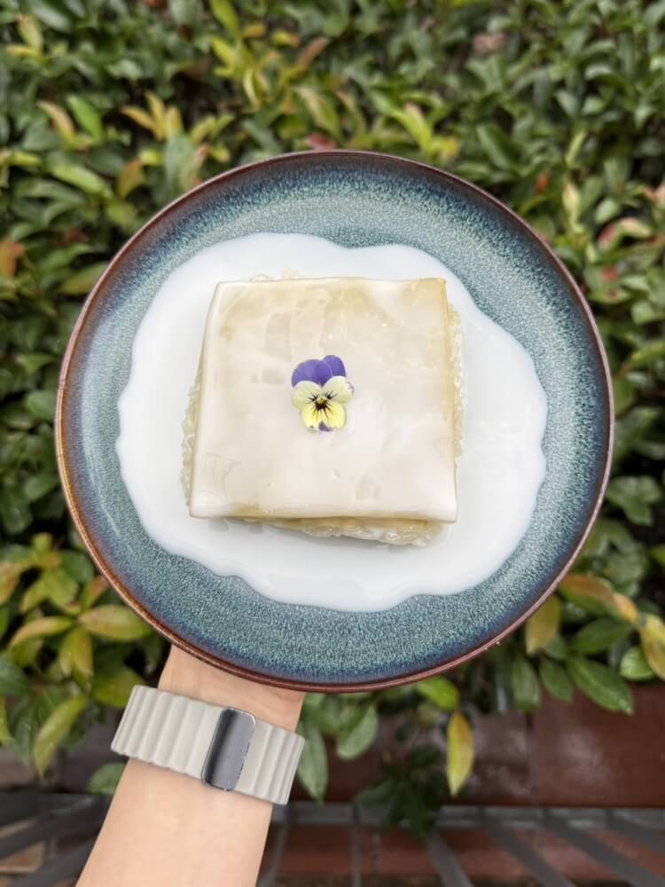 Smooth Thai-style egg custard served with sweet sticky rice and coconut cream