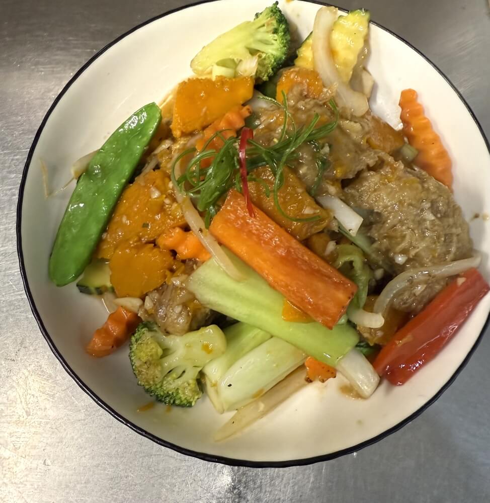 Stir fried pumpkins with oyster sauce, egg, onion, garlic and mixed vegetables (GFO = Gluten free option available)