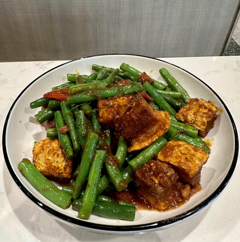 Stir fried crispy pork belly with dry red curry, green bean, garlic and kaffir lime leaves