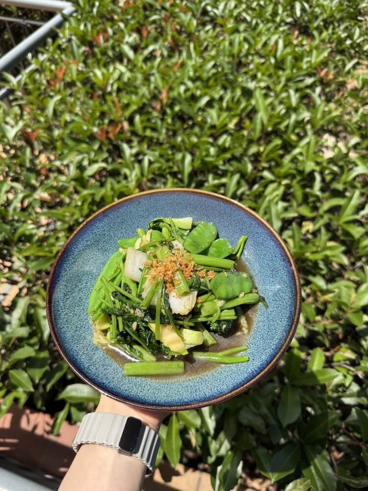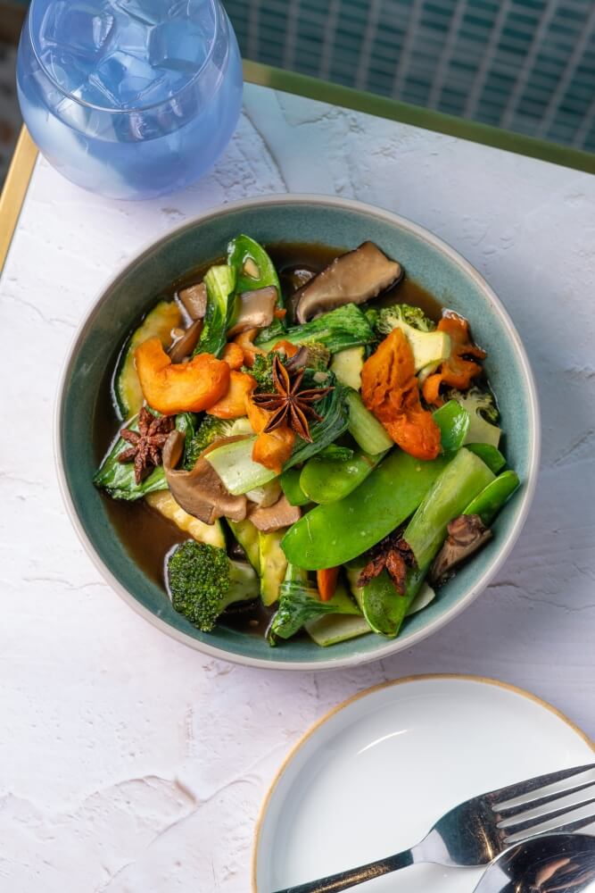 Stir-fried mixed green vegetables and vegan oyster sauce