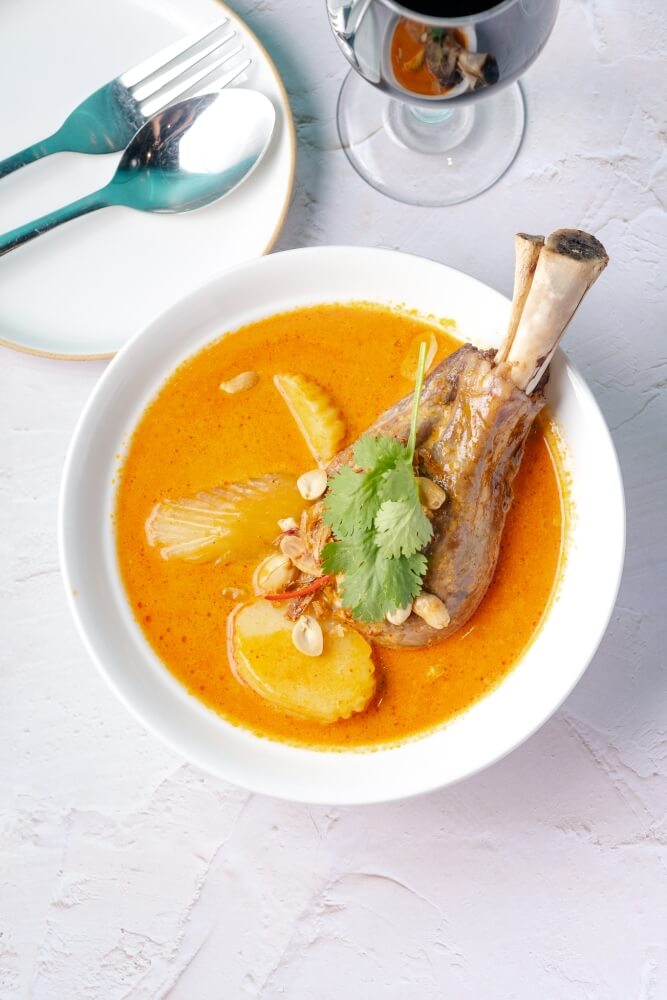 Slow cooked lamb shank, massaman curry paste, coconut milk, potato topped with roasted peanut