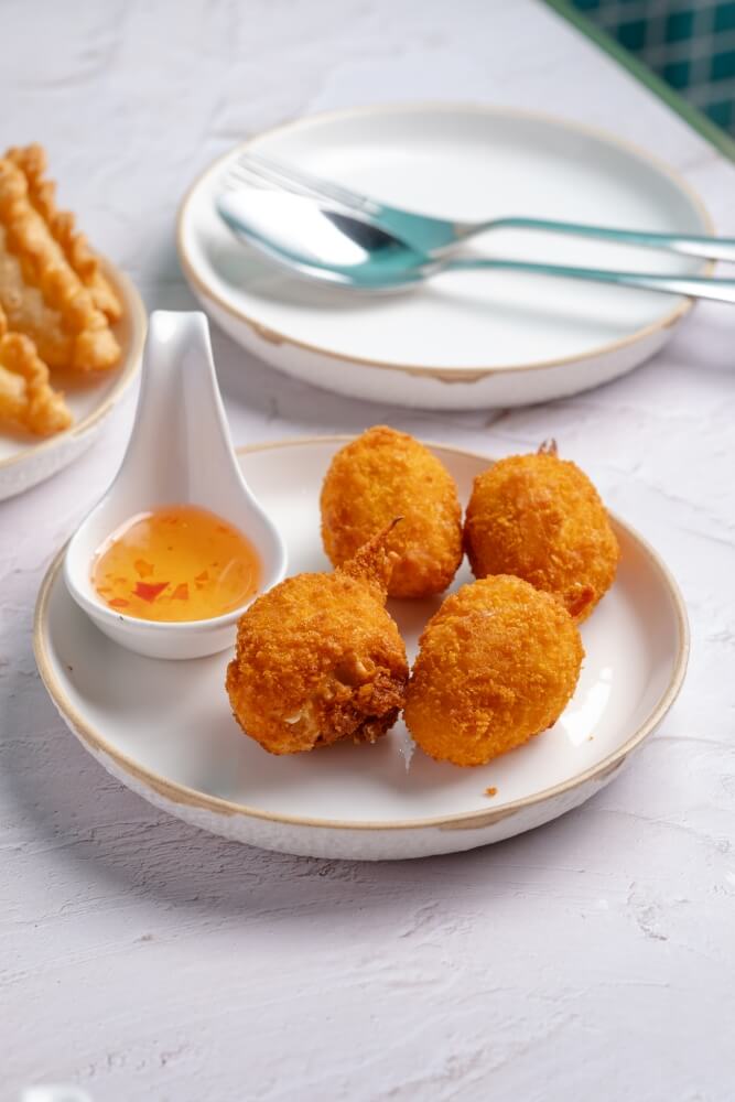Homemade deep fried finely ground prawn in bread crumbs served with plum sauce