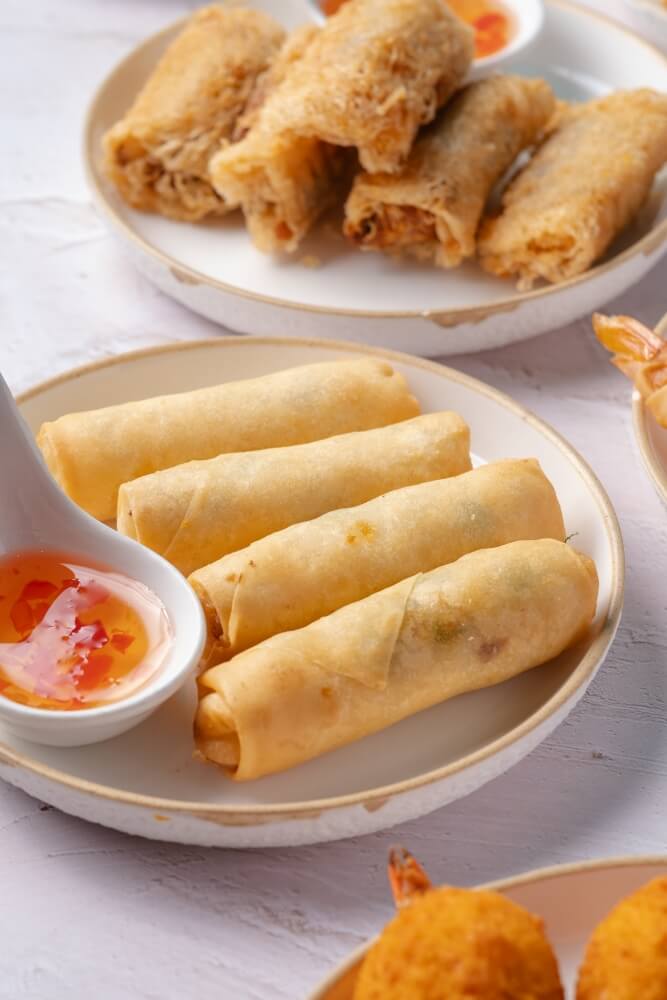 Crispy vegetable spring rolls served with sweet chilli sauce