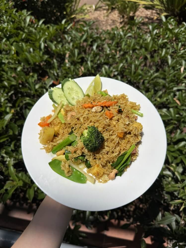 Stir-fried rice with pineapple, egg, tomato, onion, garlic, cashew nut and Chinese broccoli