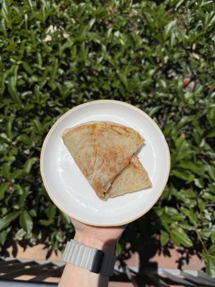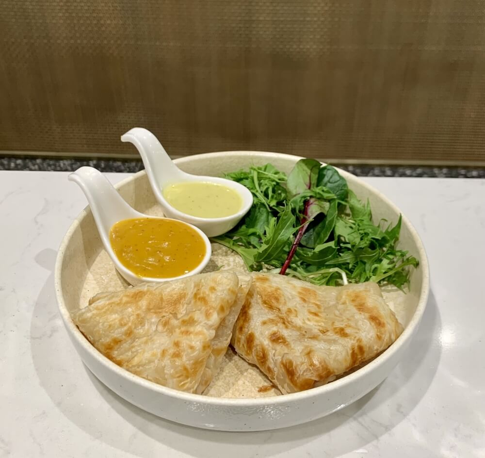 2 pieces of roti with peanut sauce and green curry dipping