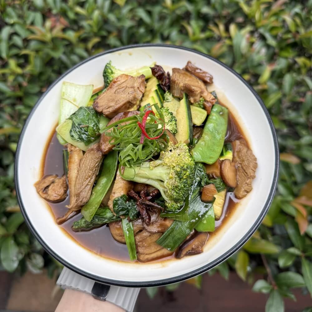 Vegan duck stir-fried with shiitake mushroom, onion, garlic, Asian green and five spices