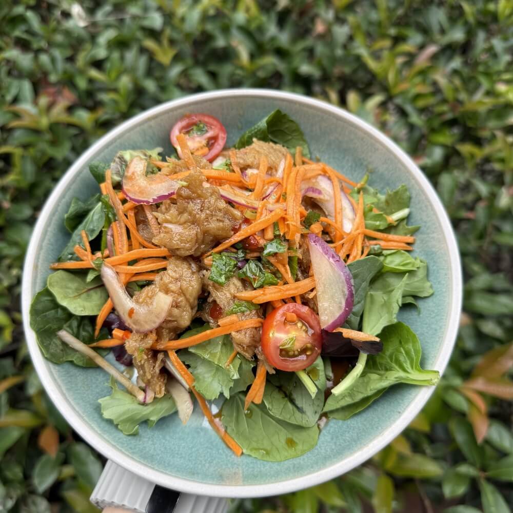 Vegan chicken salad with red onion, mint, chilli, cherry tomato, coriander and Thai dressing