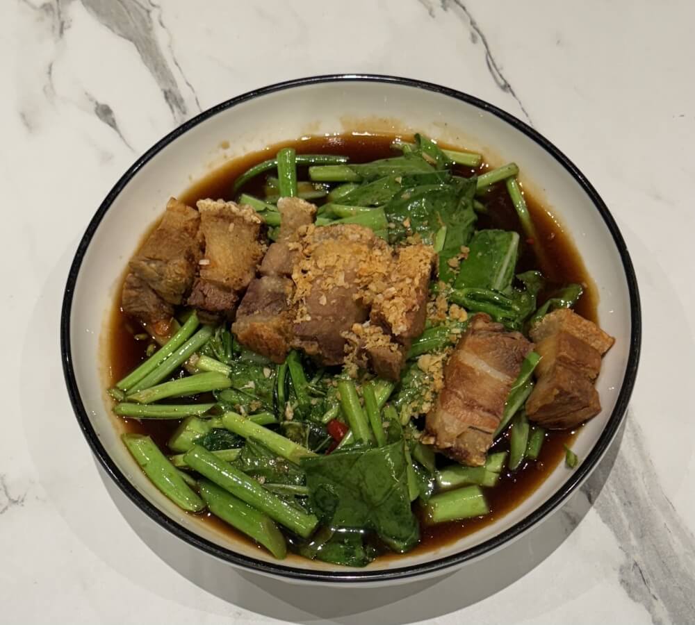 Stir-fried morning glory and crispy pork belly with fermented yellow bean, chilli, garlic and oyster sauce (GFO = Gluten free option available)
